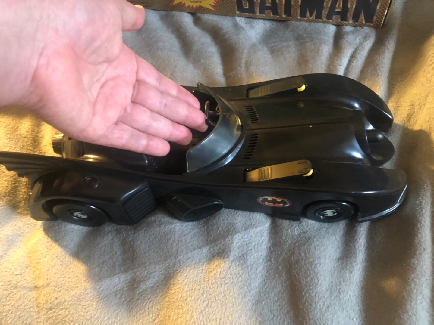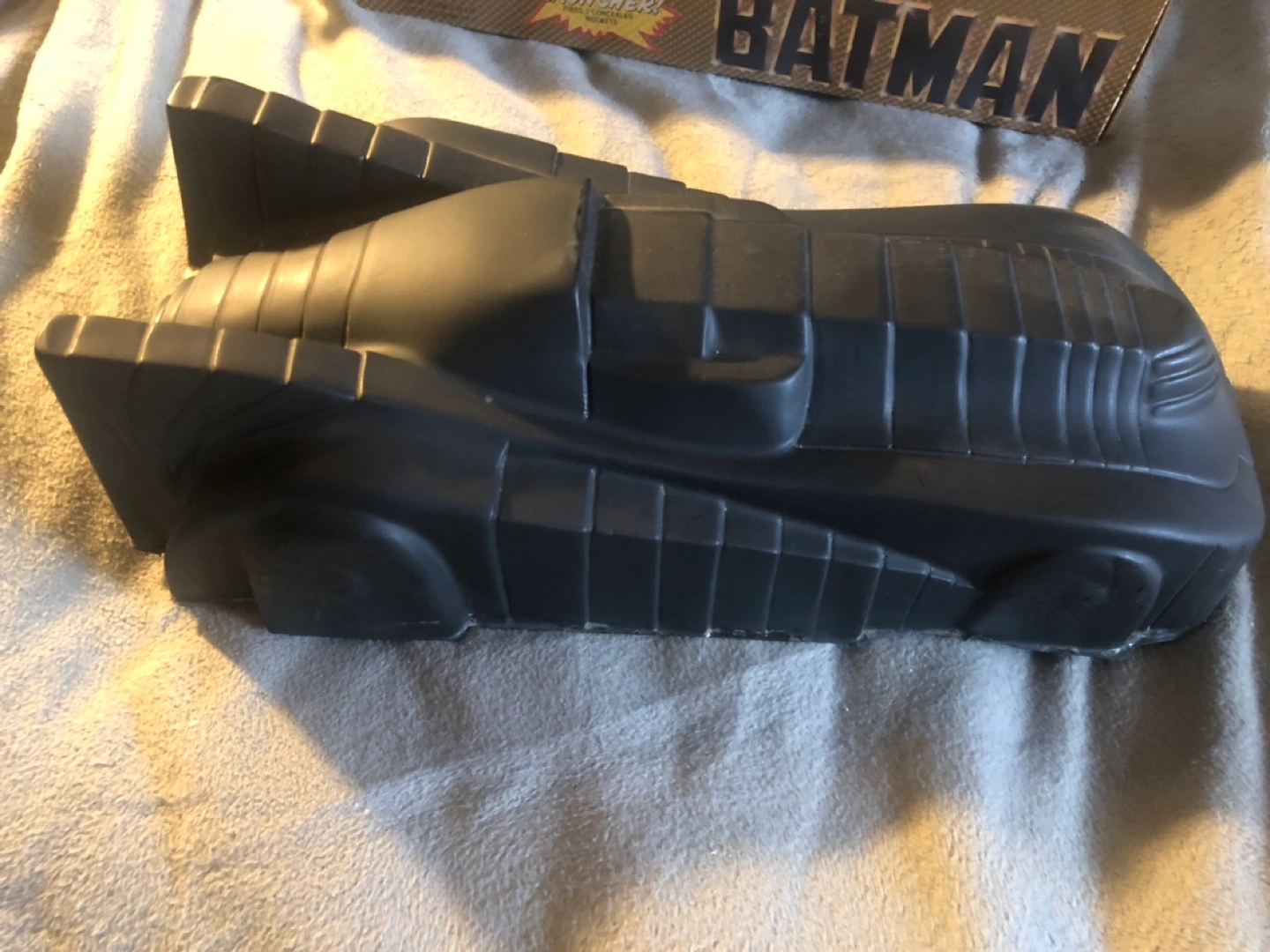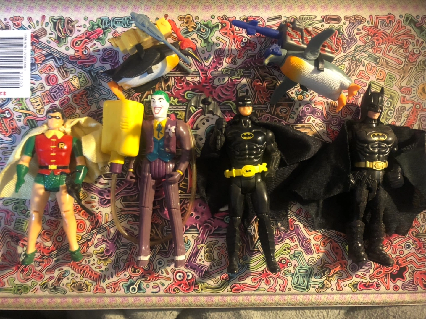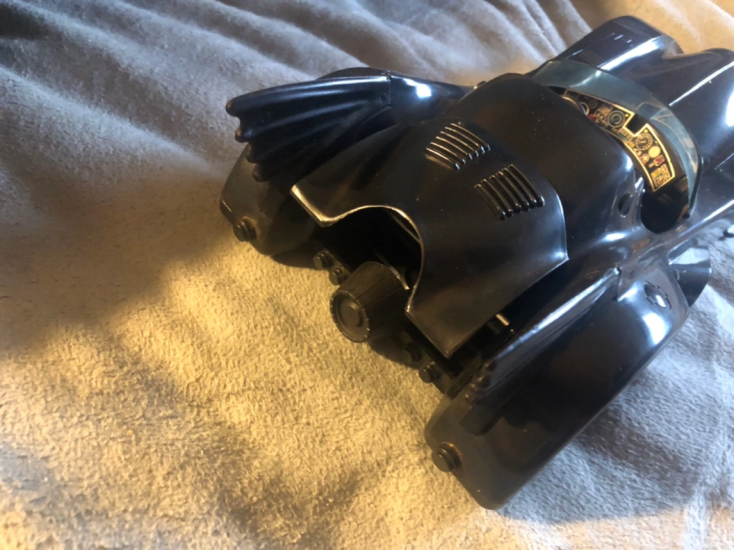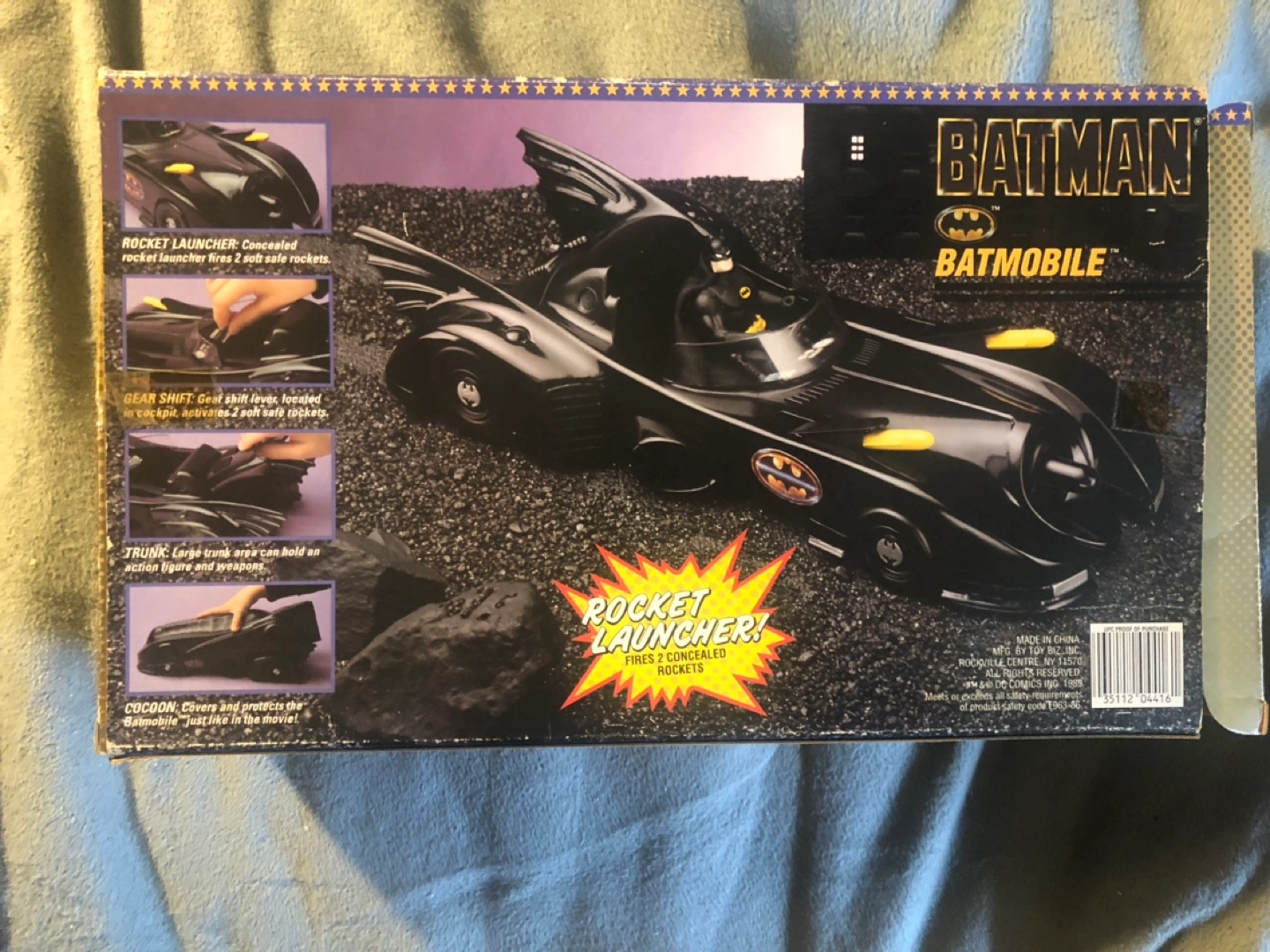 Tim Burton’s Batmobile 100% complete vintage 1989 from Toybiz with missles that still fire, “shell” (repainted in matte black cuz it looked cooler lol) and original box. Includes Batman ‘89, Robin ‘89, Joker ‘89, Batman ‘92, attack penguins ‘92.