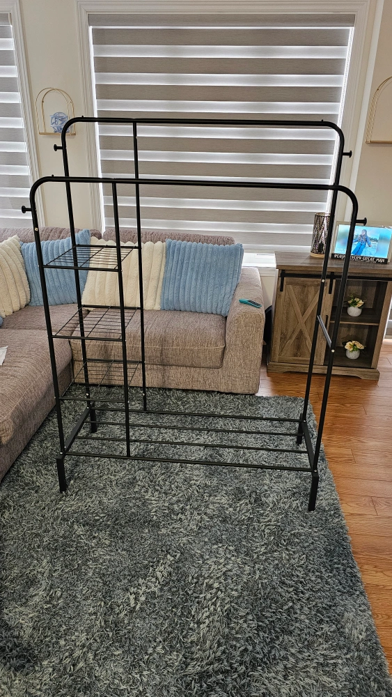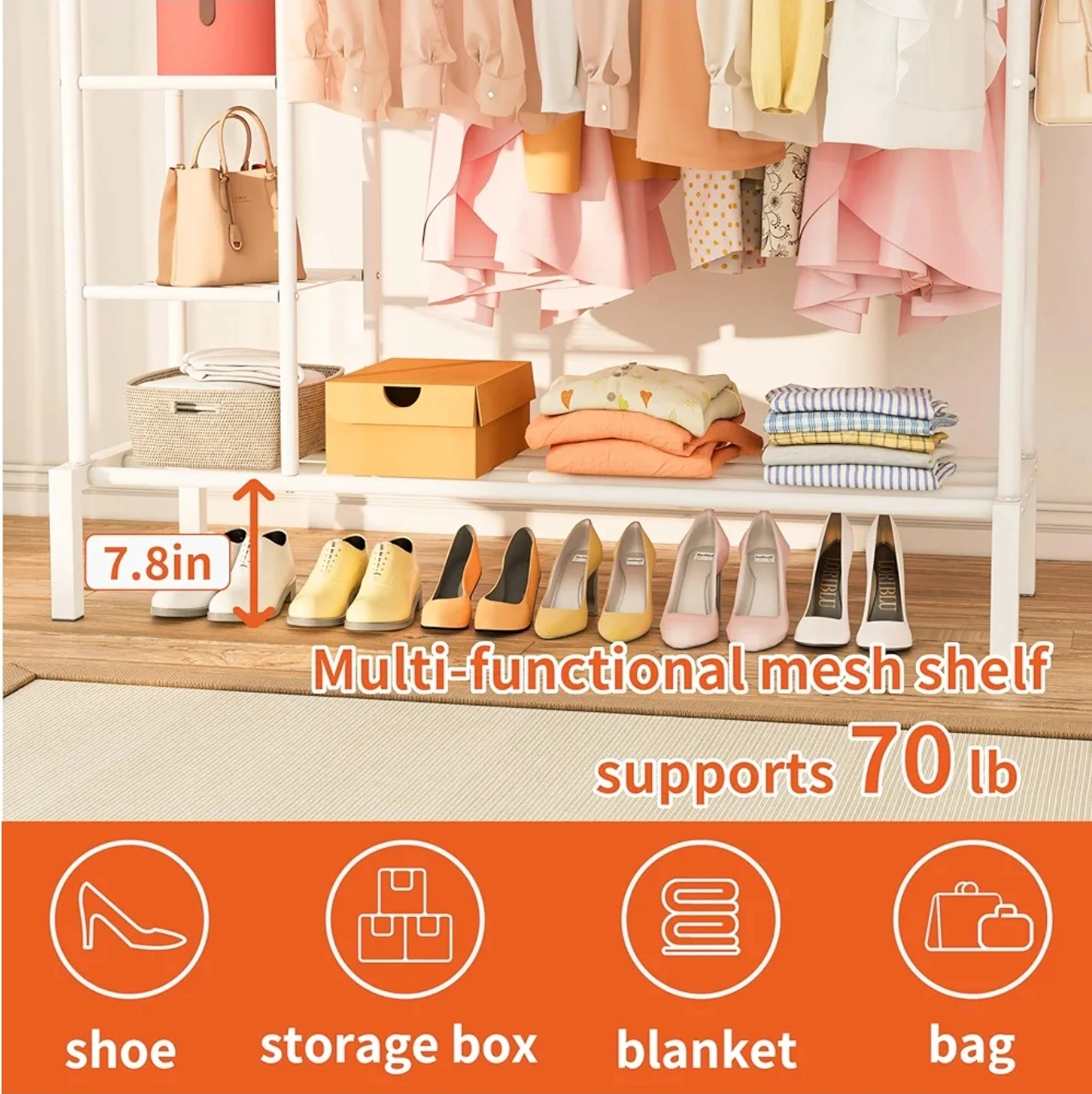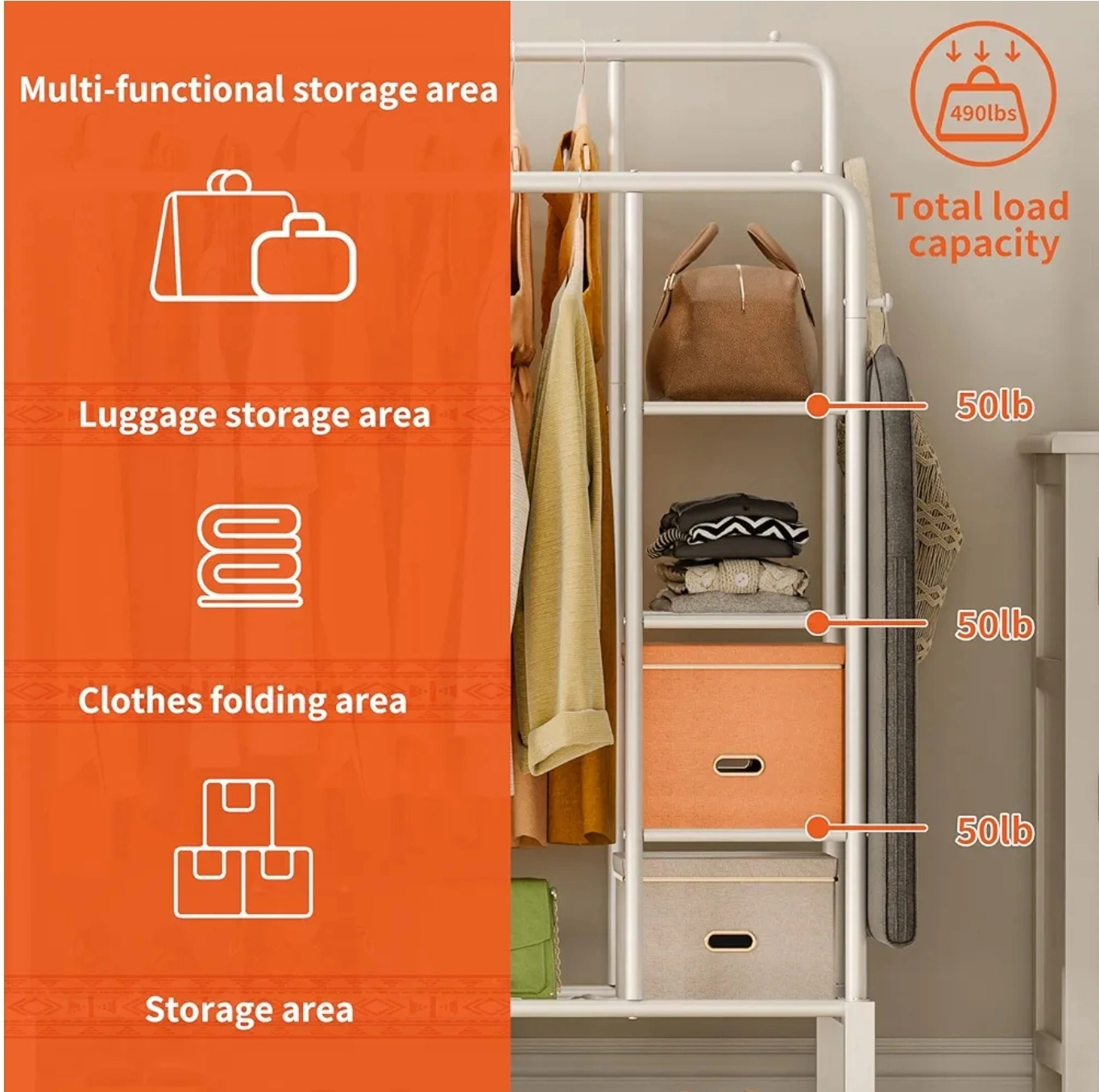 Freestanding garment rack. Multiple shelves for storage. Black metal frame. Easy assembly. Great for organizing clothes and accessories.