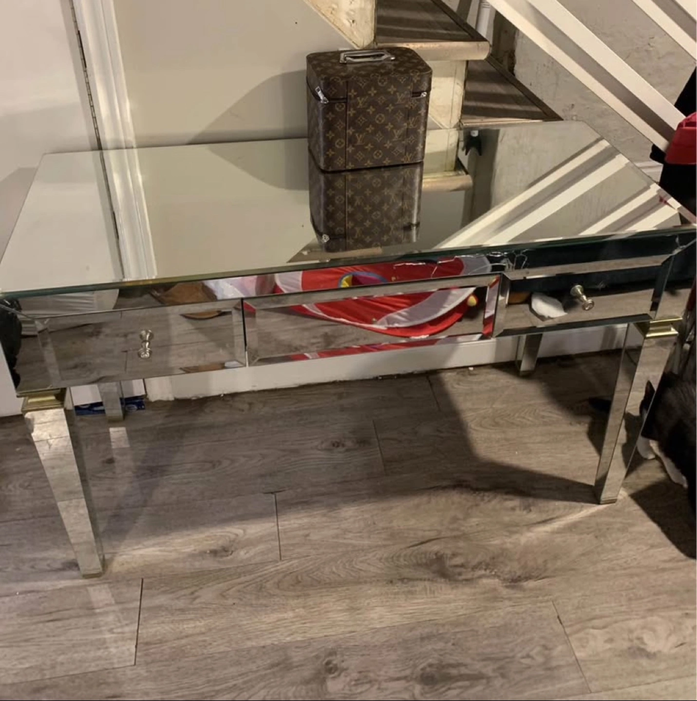 Sleek mirrored vanity desk. Features one drawer. Modern design. Great for bedroom or home office.