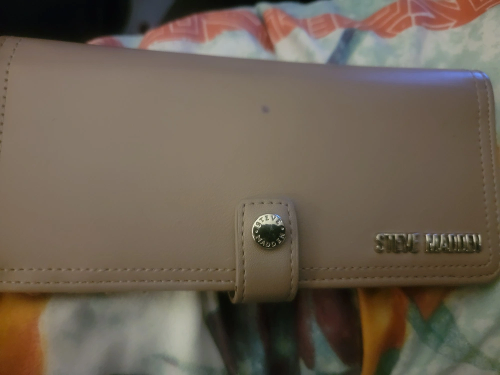 Pale pink leather wallet. Features a snap closure and embossed branding. Excellent condition. No longer needed.