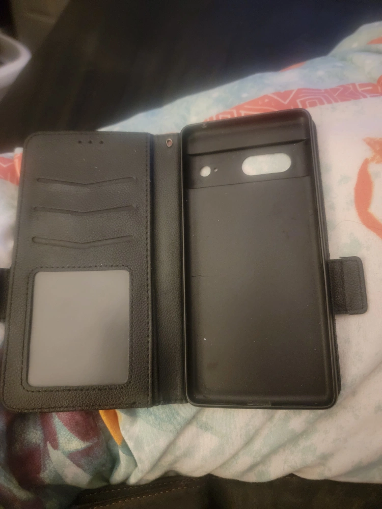 Used phone case. Black leather. Wallet-style. Card slots and window. Compatible with a phone with a single rear camera. Doesn't fit my phone.