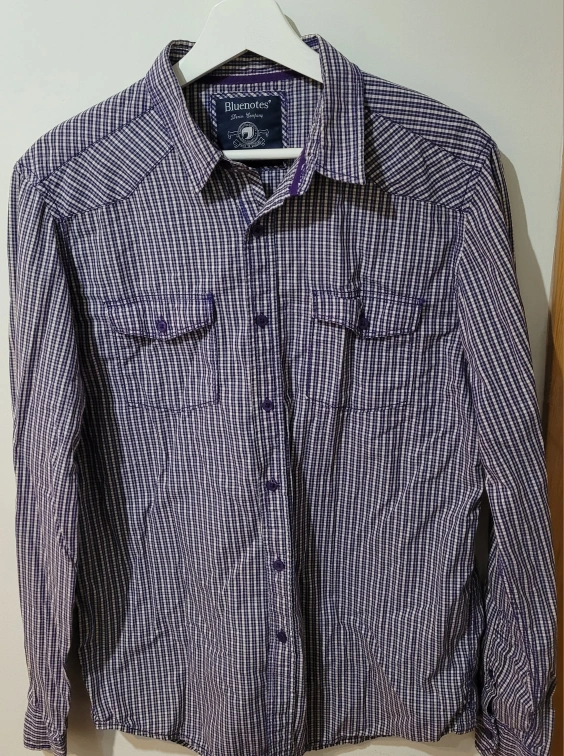 Men's long sleeve button-up shirt.Purple and white plaid pattern with two chest pockets. ♡No Holds ♡First Come First Serve ♡Serious Buyers Only Please.