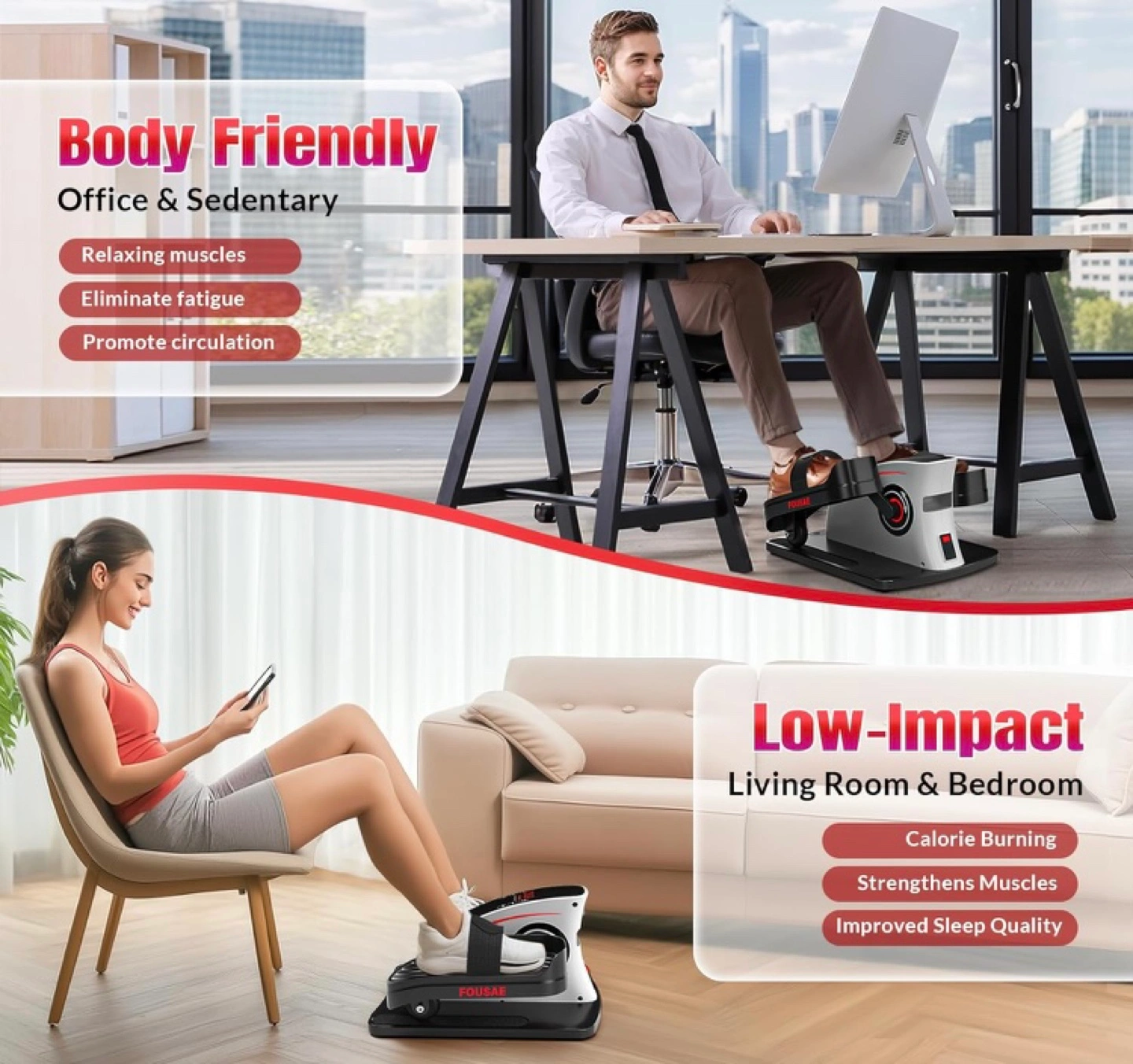 Quiet and compact electric pedal exerciser. Leg exercise while sitting. Features remote control and display monitor. 15 speed levels. Improves circulation, burns calories, strengthens muscles. Ideal for office, living room, or bedroom use.
