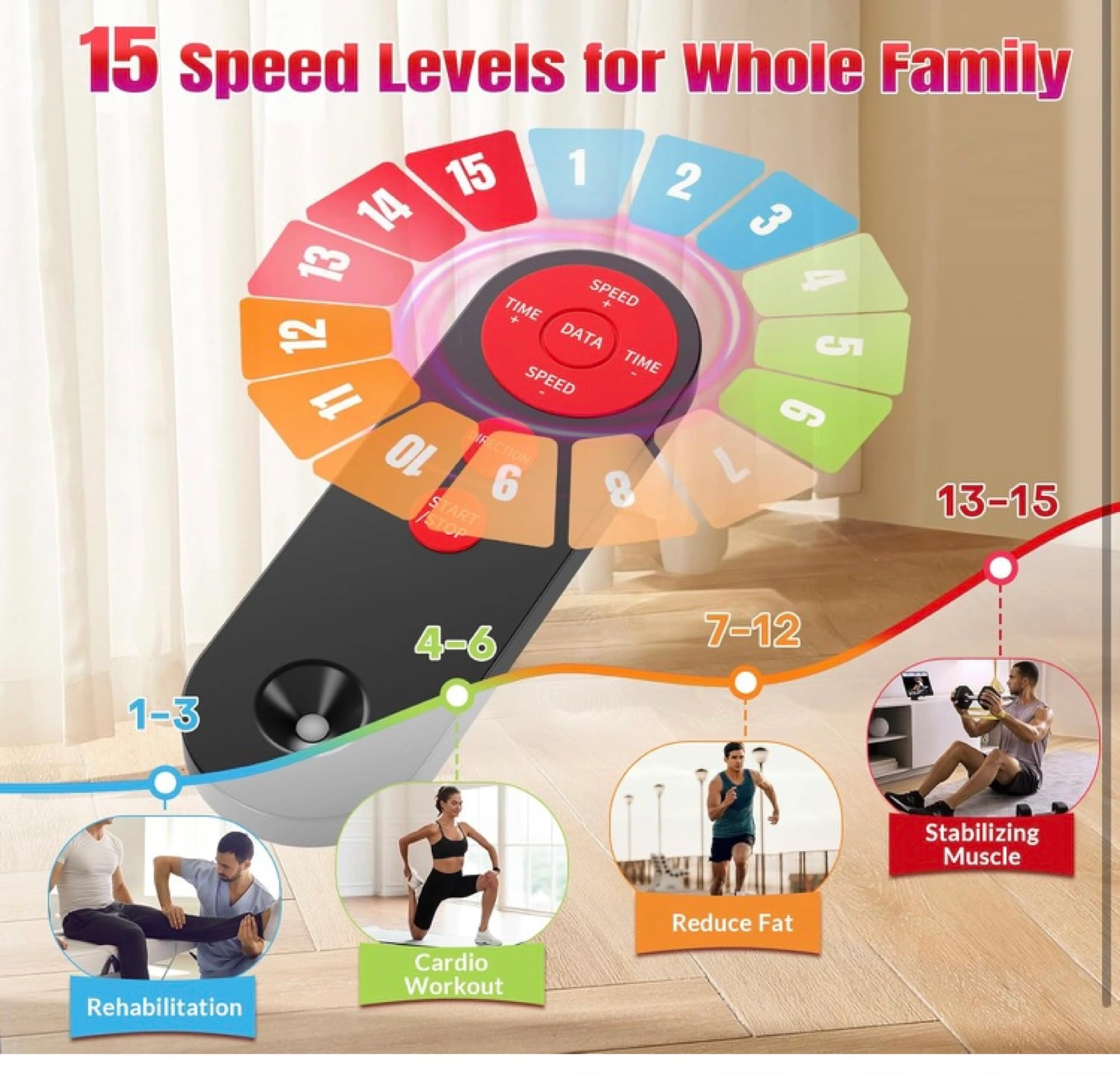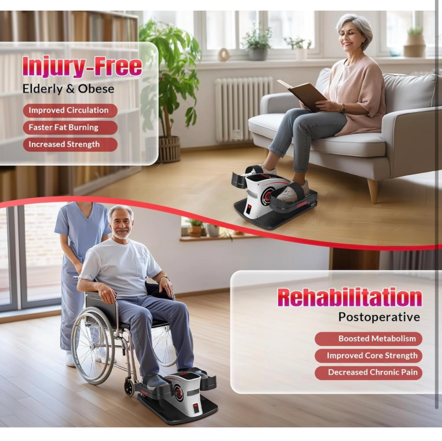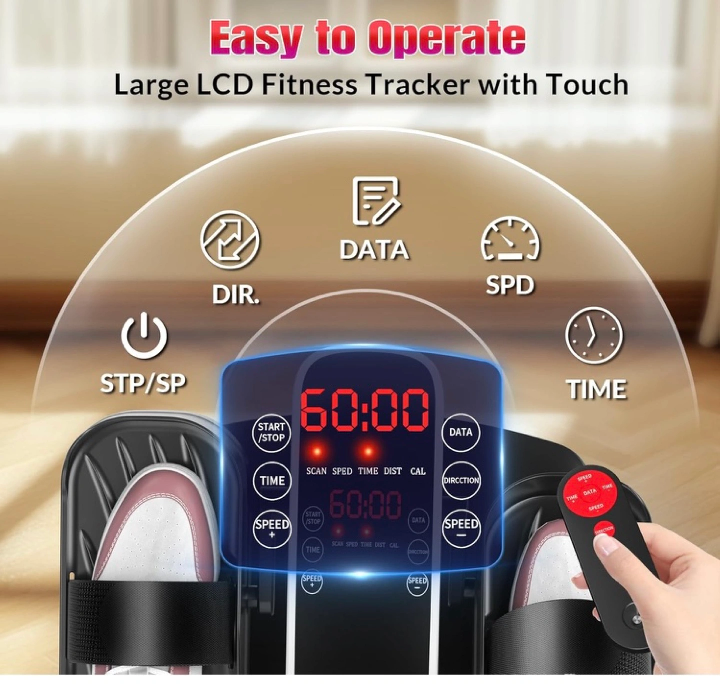 Quiet and compact electric pedal exerciser. Leg exercise while sitting. Features remote control and display monitor. 15 speed levels. Improves circulation, burns calories, strengthens muscles. Ideal for office, living room, or bedroom use.