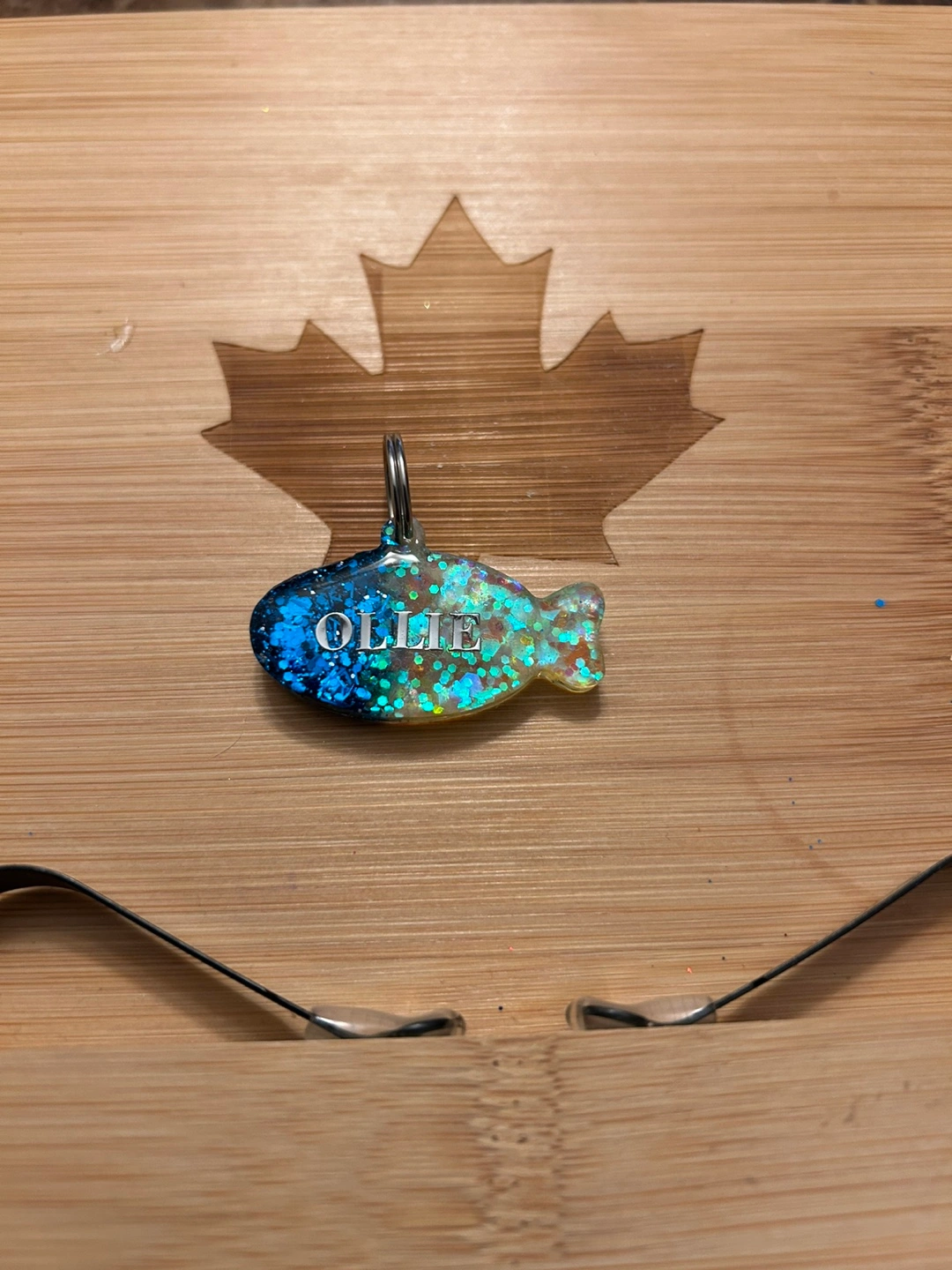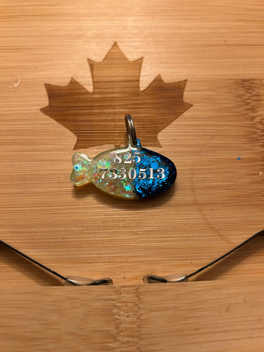 Cute fish-shaped pet ID tag. Personalized with name or number. Resin material. Blue and yellow glitter. Durable and lightweight. Perfect for cats and dogs.