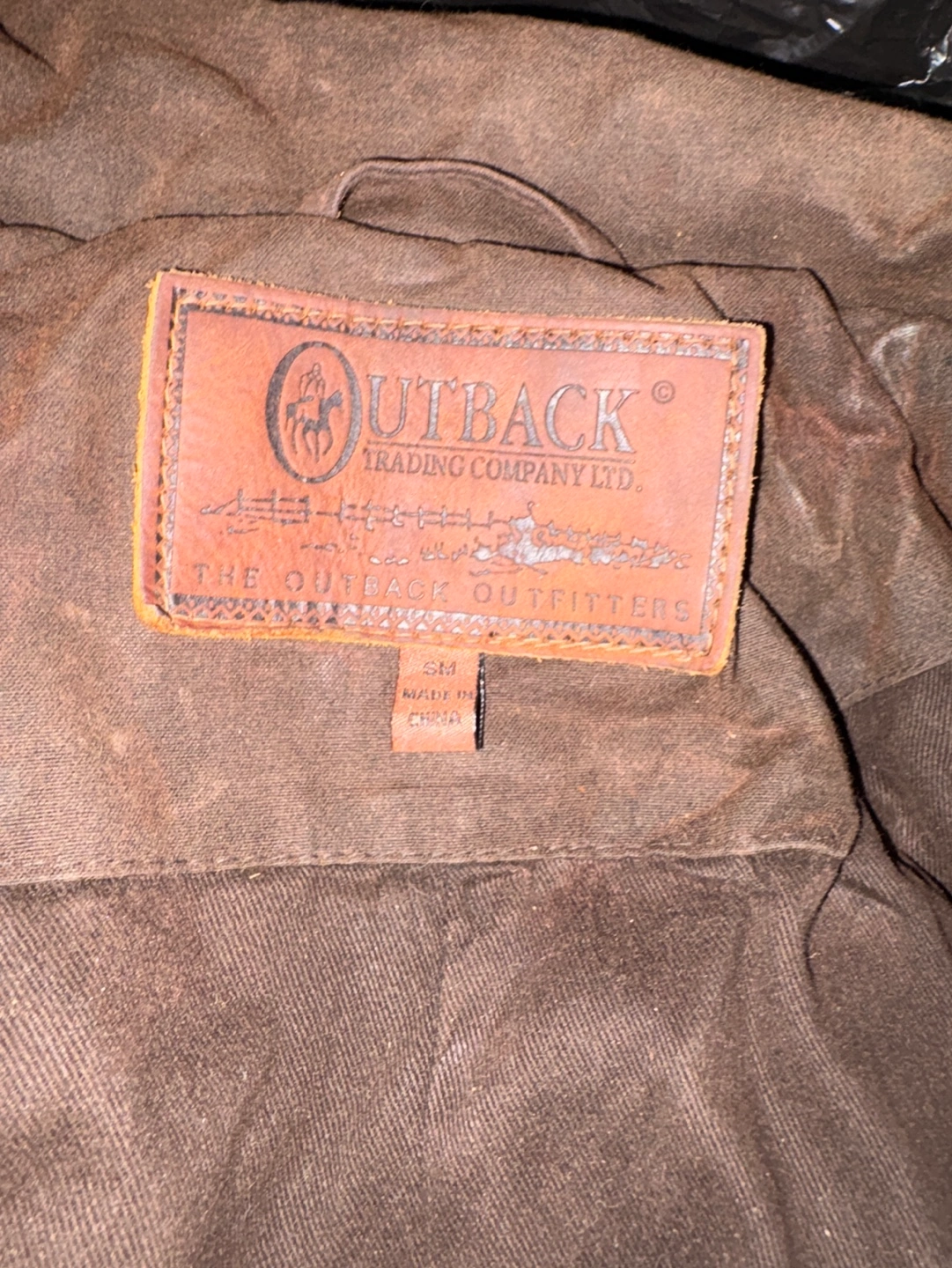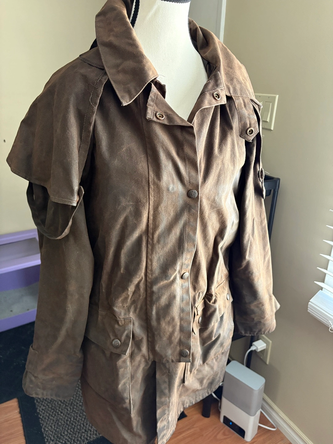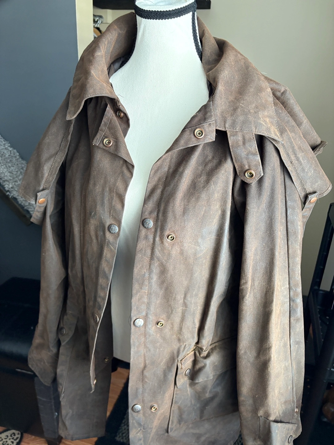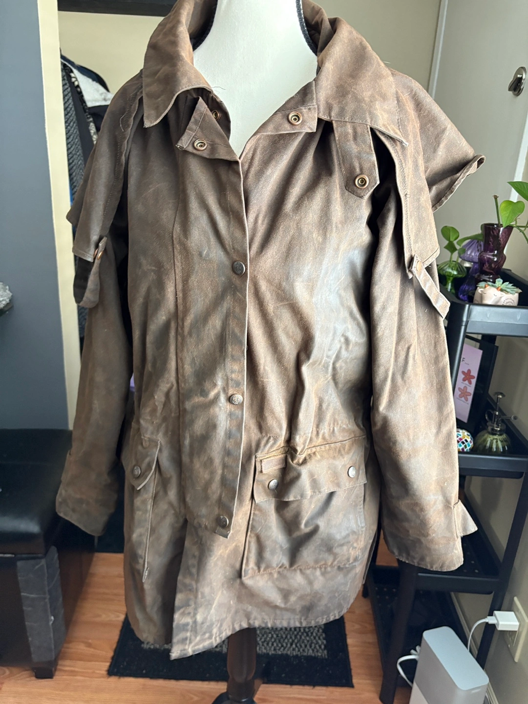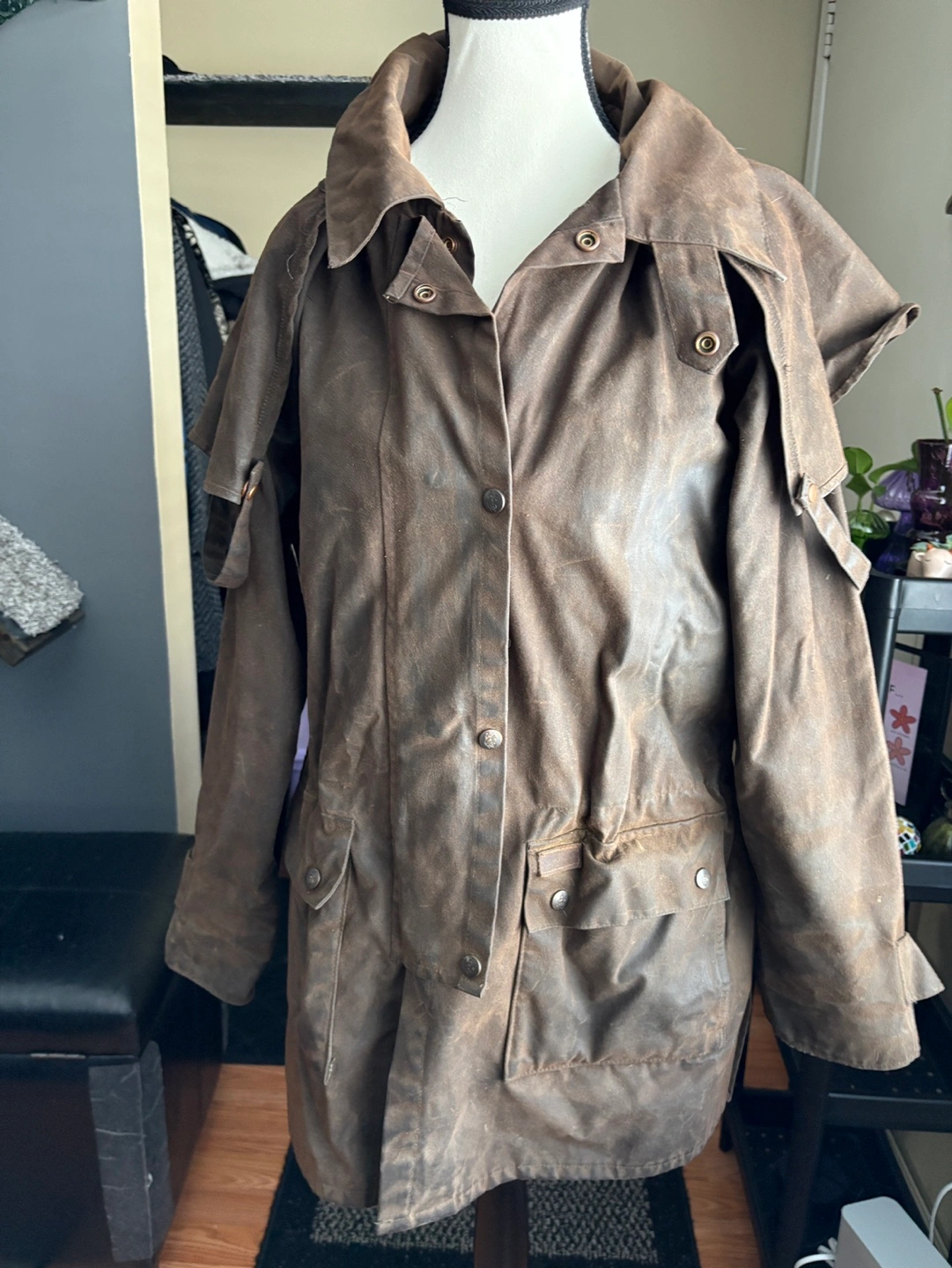 Size small from Outback Trading Company Waterproof and breathable Long lined sleeves, security pocket, detachable cape, storm flap, throat patch, drawstring waste