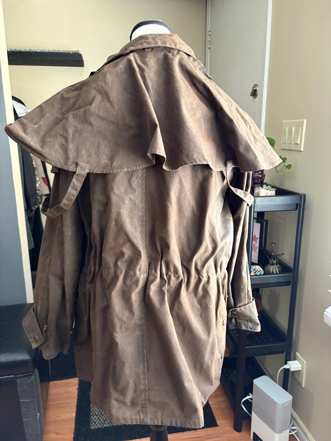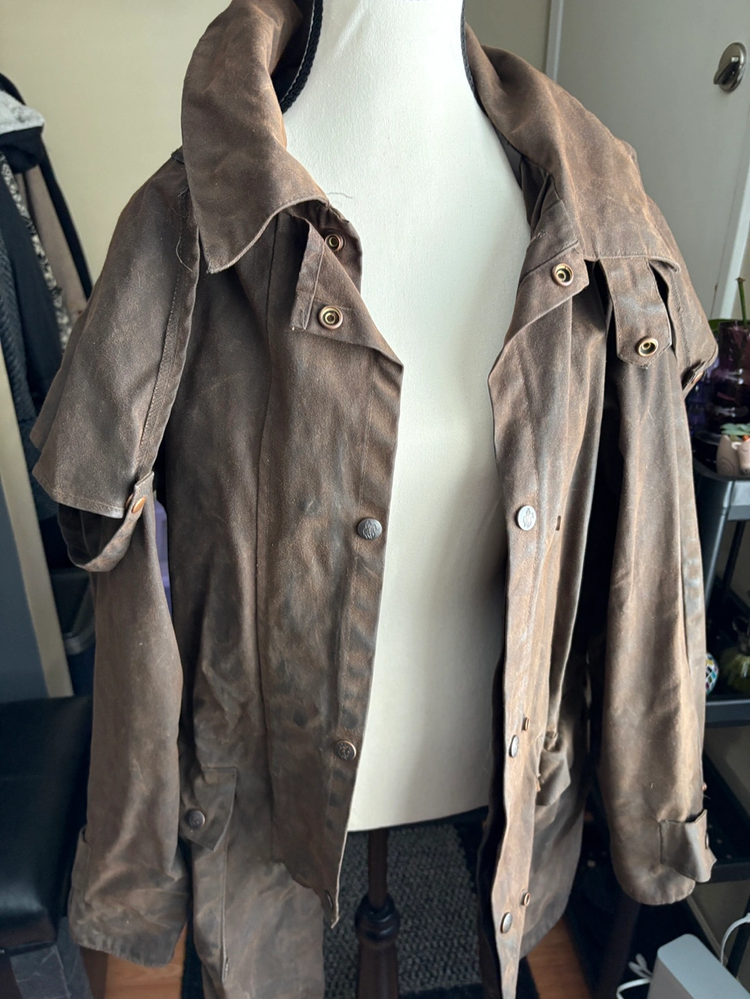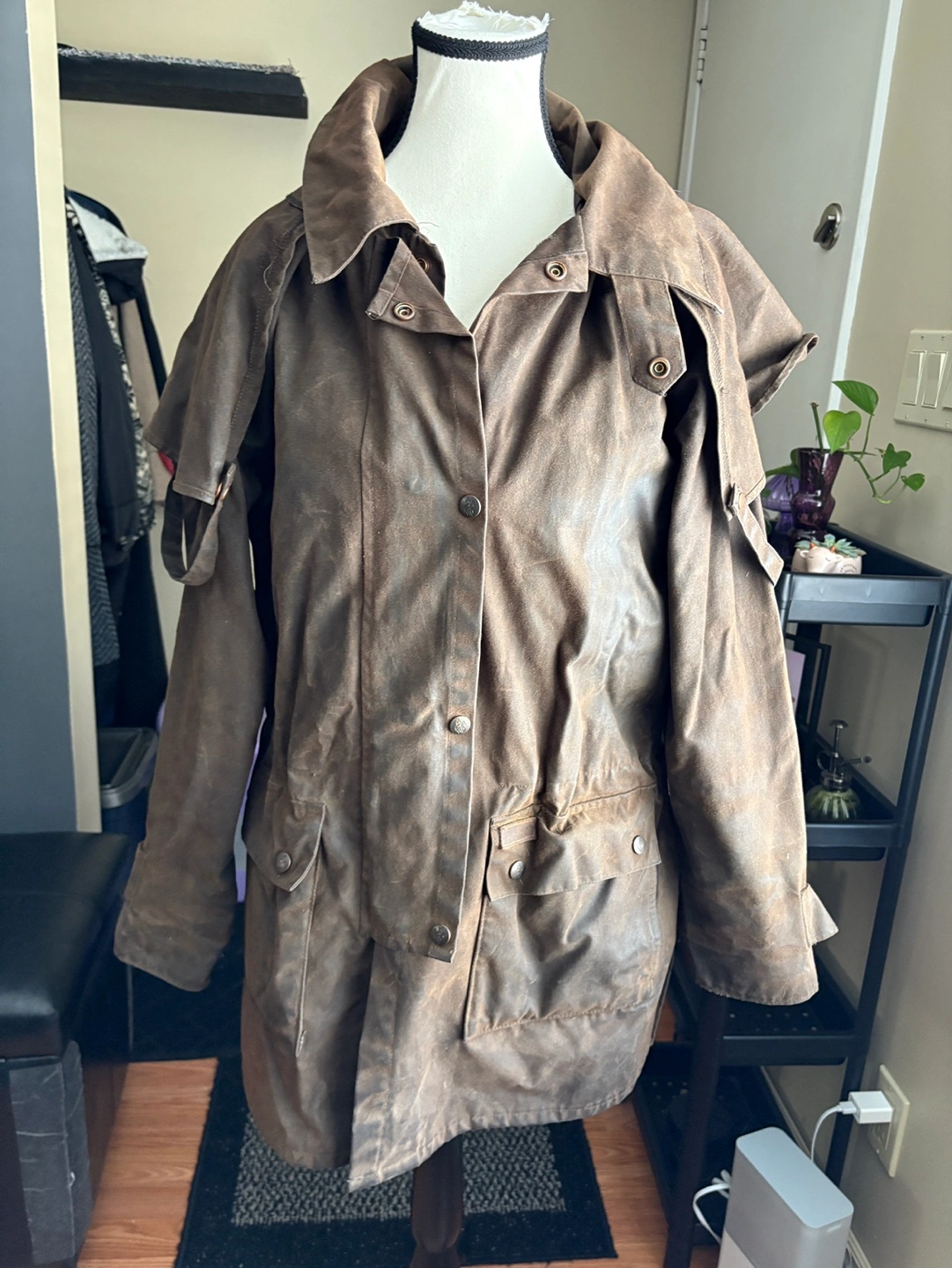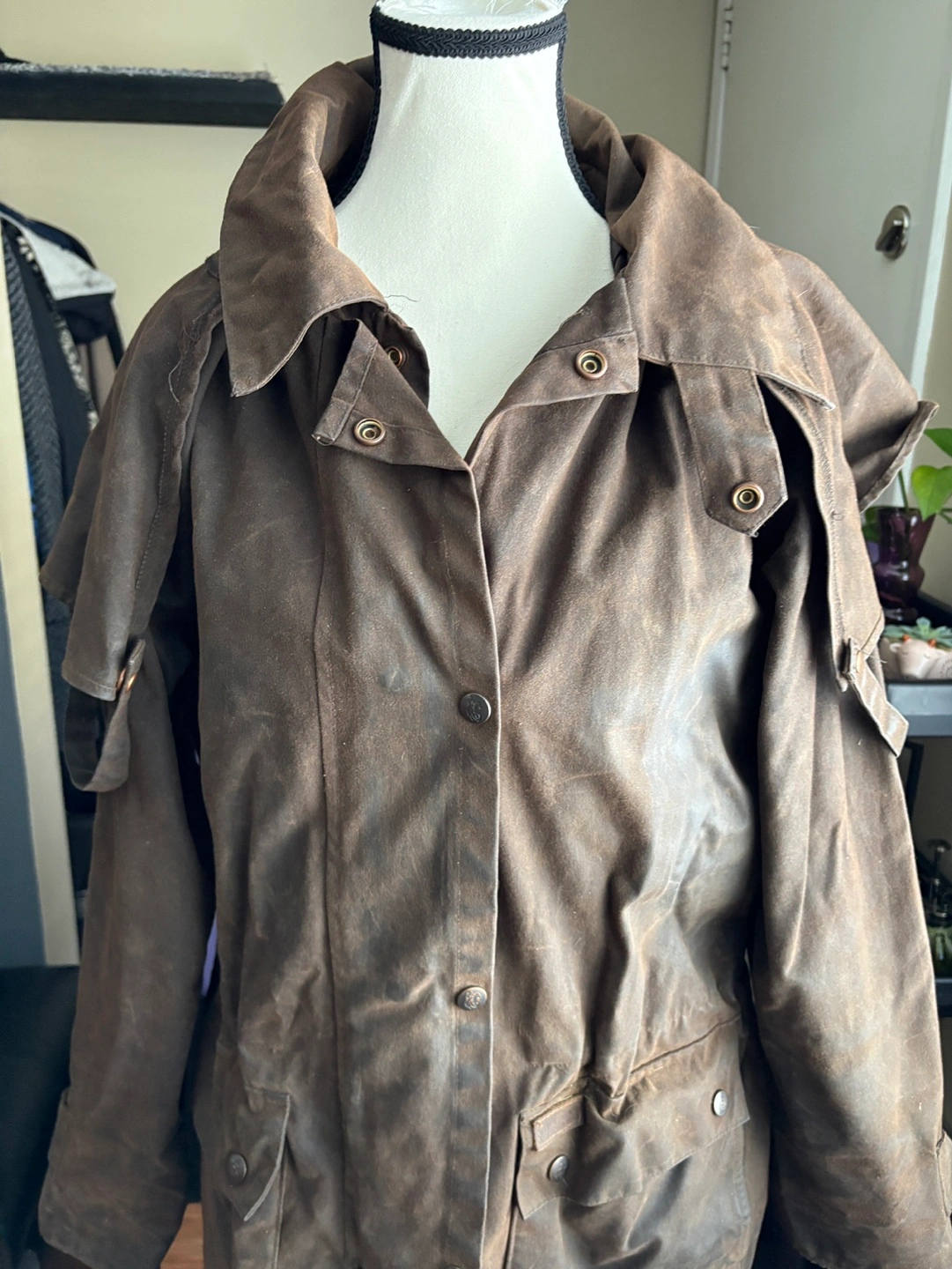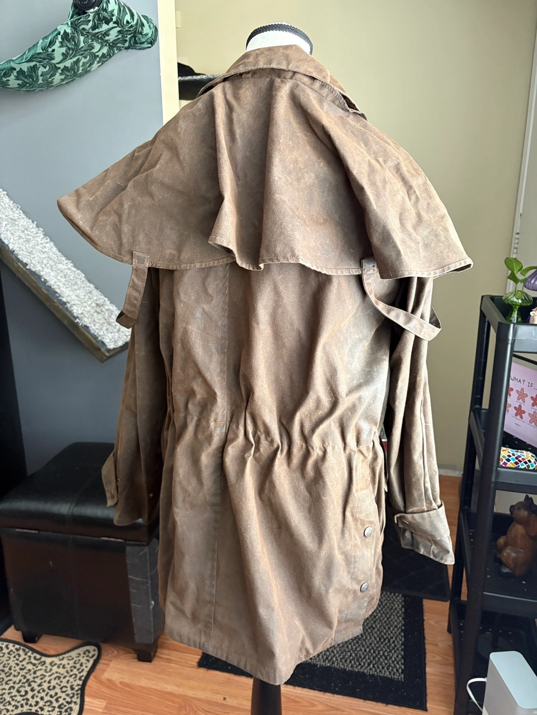 Size small from Outback Trading Company Waterproof and breathable Long lined sleeves, security pocket, detachable cape, storm flap, throat patch, drawstring waste