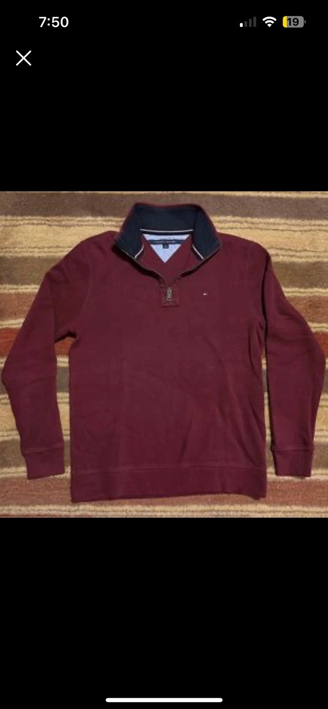 For sale is an authentic, burgundy, Tommy Hilfiger 1/4 zip sweater in size medium. The sweater is in good condition, no rips, stains or odours. It is clean and ready to be worn.