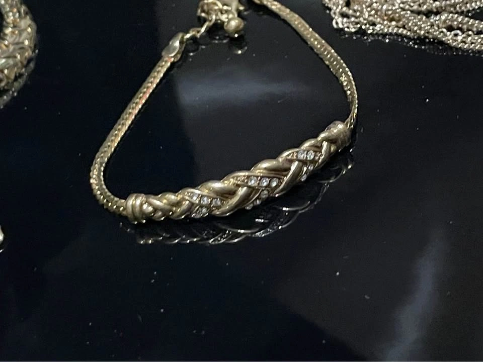 Vintage elegant gold toned jewelry collection includes various chain styles and decorative pieces. Set has multiple necklaces with different link patterns, two bracelets, and a pair of leaf shaped drop earrings. One bracelet features a braided center design accented with small clear stones. Material is metal with a polished gold colored finish.