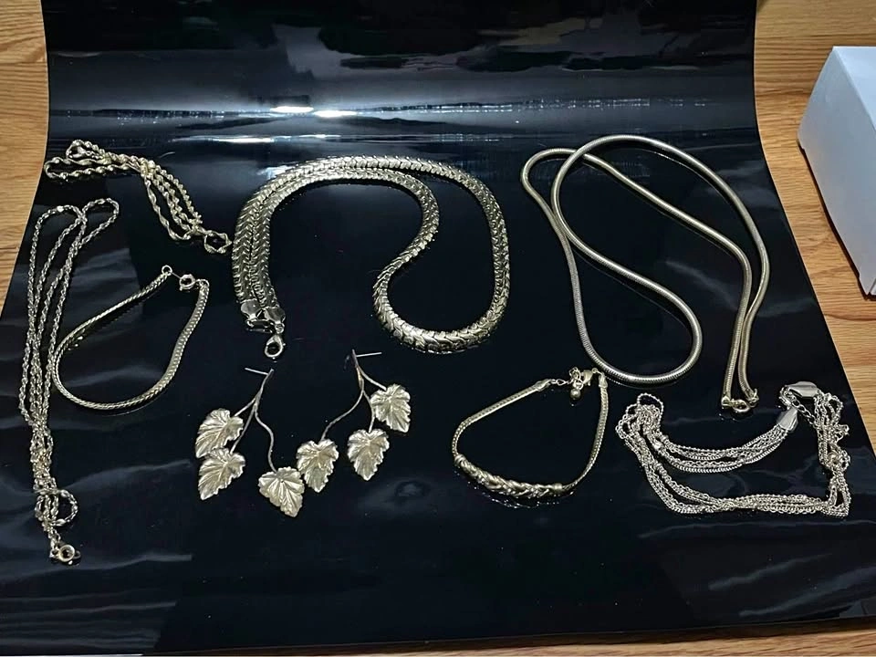Vintage elegant gold toned jewelry collection includes various chain styles and decorative pieces. Set has multiple necklaces with different link patterns, two bracelets, and a pair of leaf shaped drop earrings. One bracelet features a braided center design accented with small clear stones. Material is metal with a polished gold colored finish.