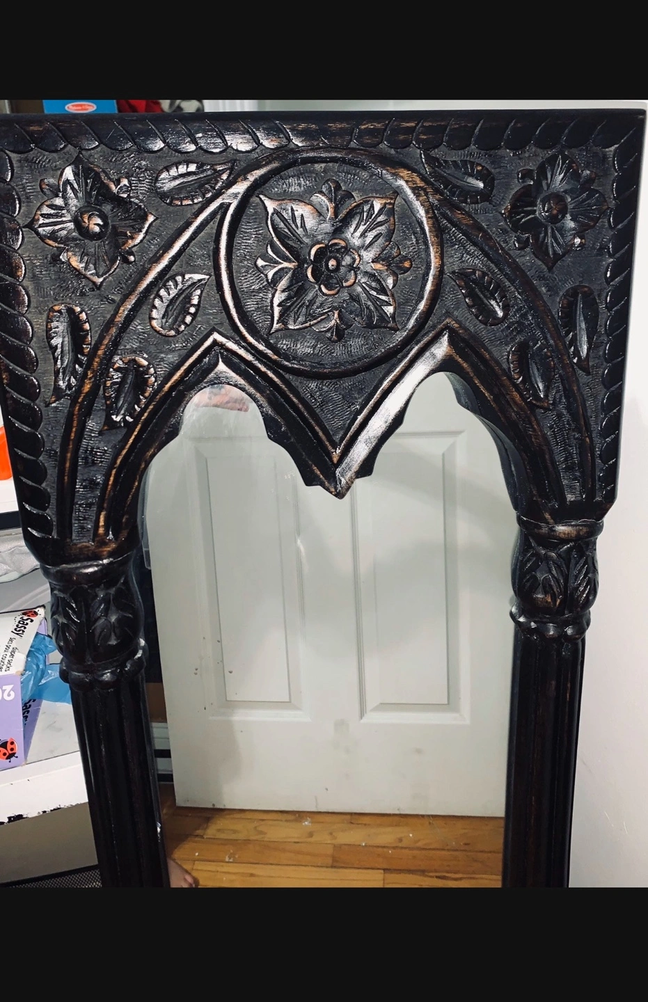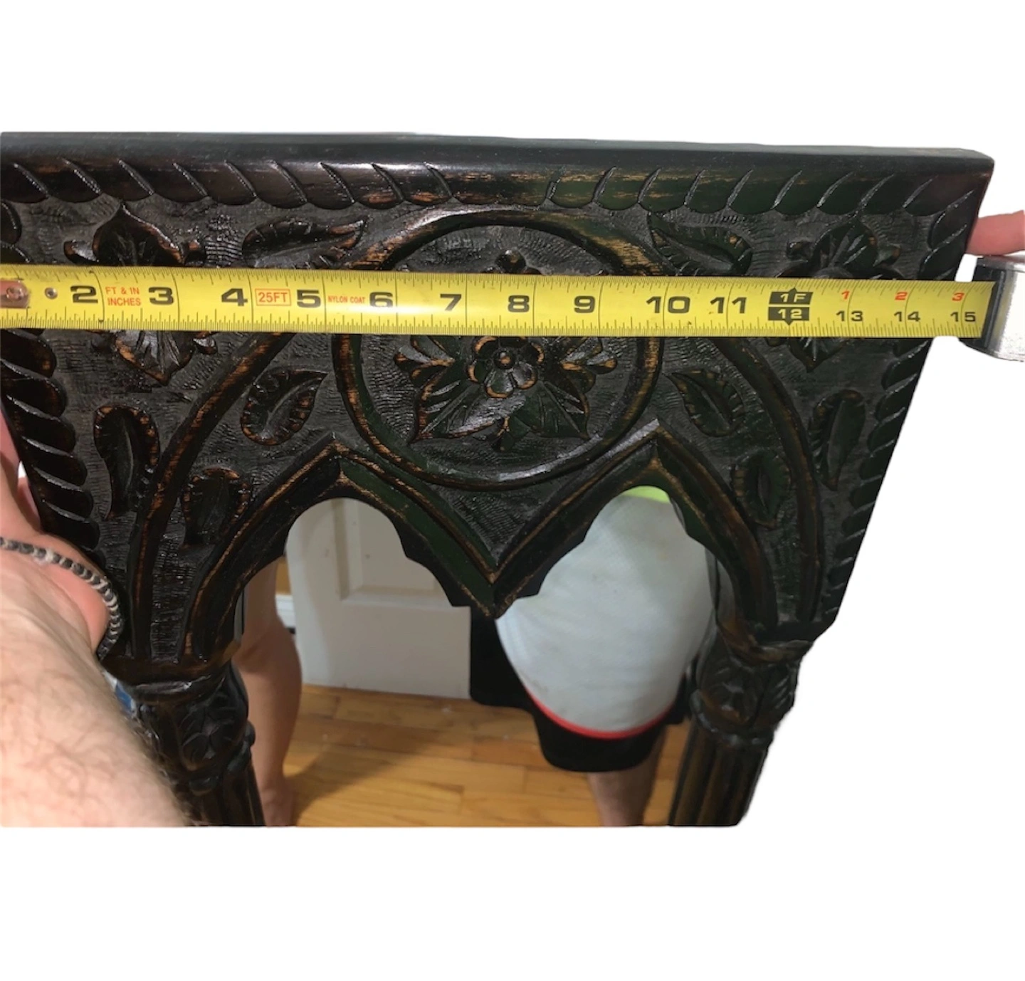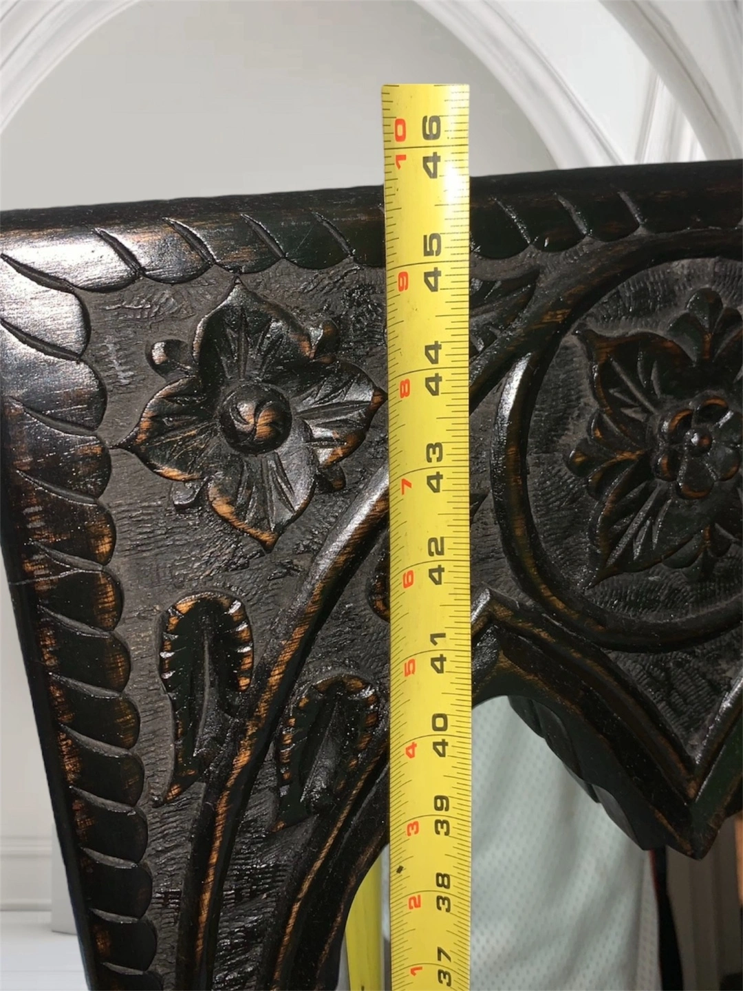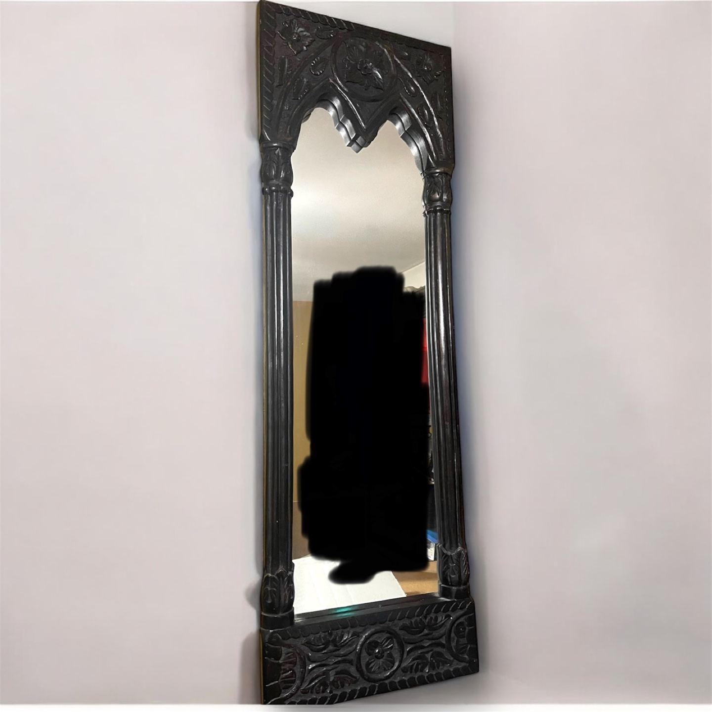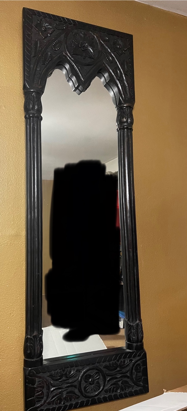 Beautiful dark wood mirror. Intricate carvings. Arch top. Measures approximately 46 inches tall. Free standing or wall mountable.