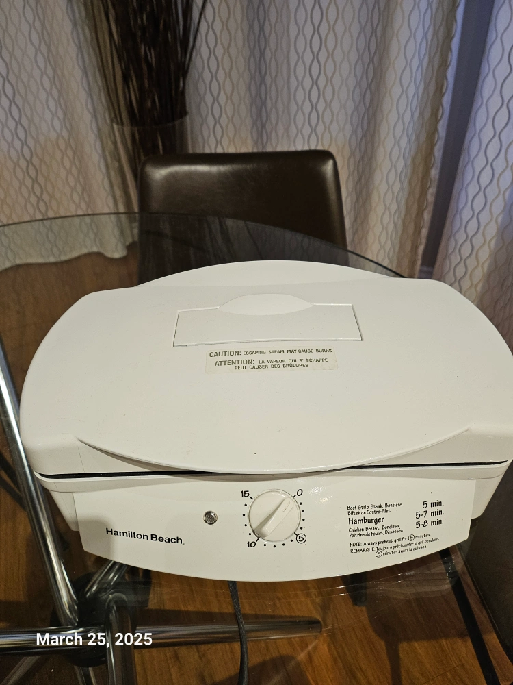 White electric contact grill. Features adjustable temperature control. Great for cooking various foods, including hamburgers, chicken breast, and steak. Compact and easy to store.
