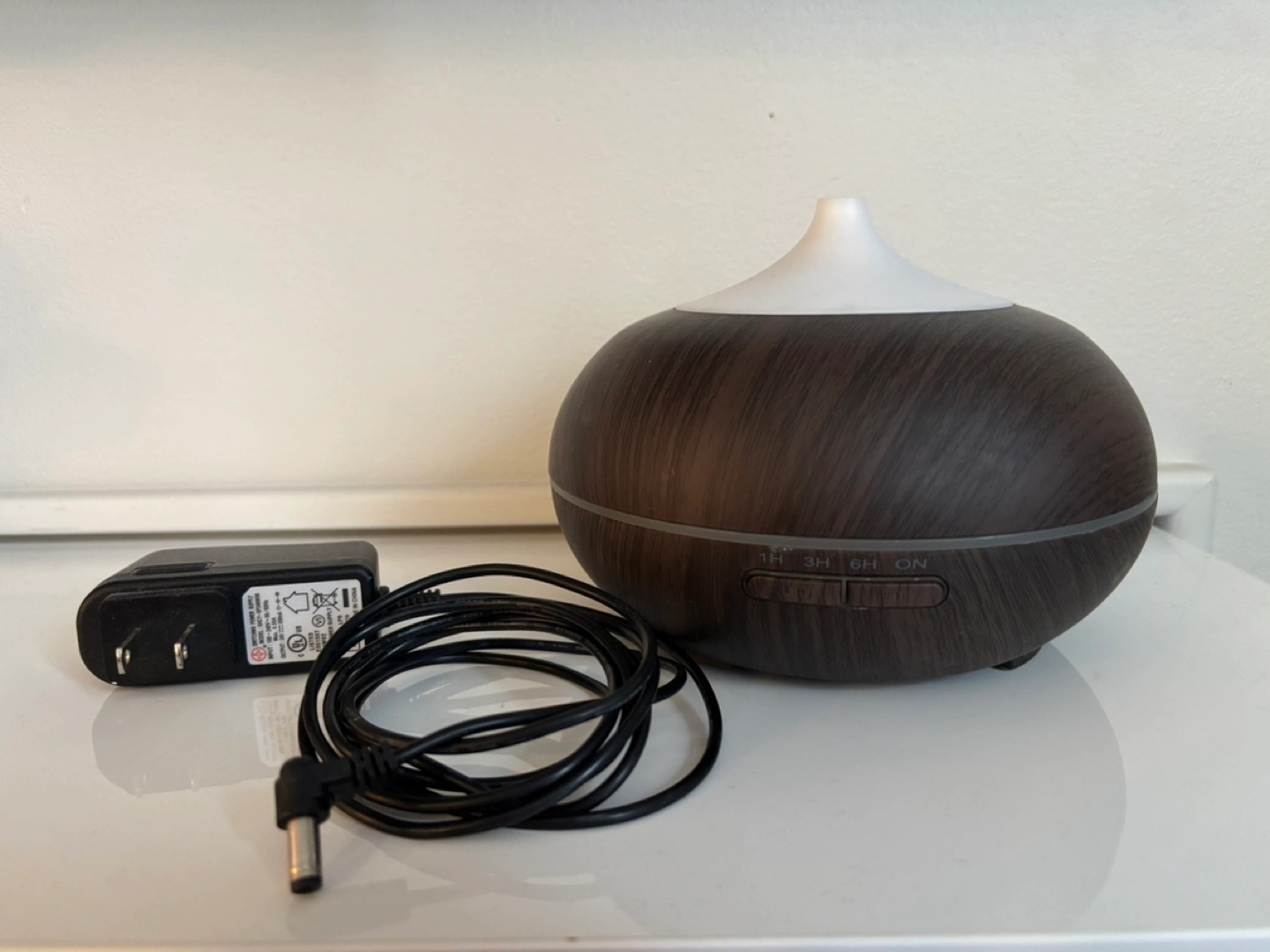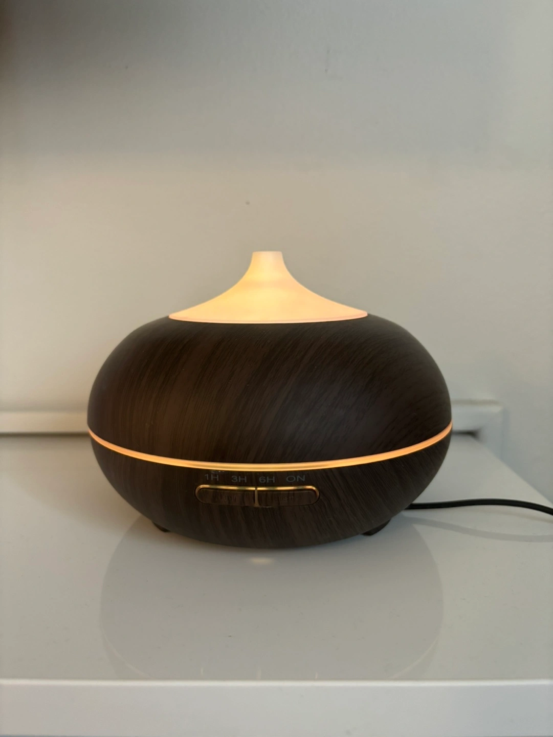 Aroma diffuser. Dark wood. Timer settings: 1H, 3H, 6H, ON. Includes power adapter.