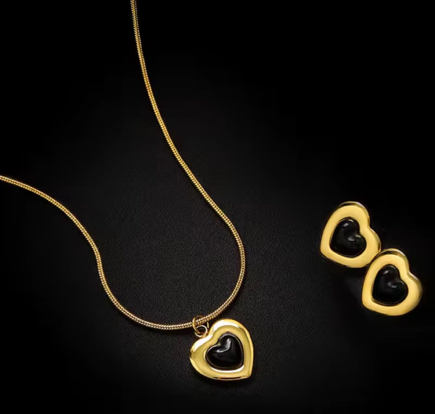 Elegant gold necklace and earrings set. Stainless steel hypoallergenic and non tarnish. Features black heart pendants. Snake chain necklace. Perfect for everyday wear or special occasions.