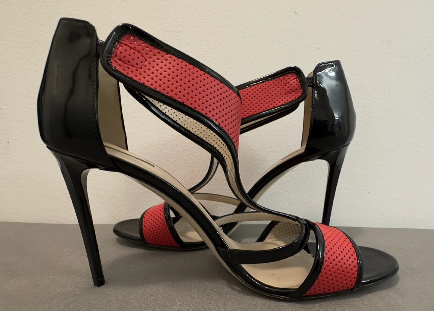 Elegant black and red high heels. Made in Italy. Genuine leather. Ankle strap.