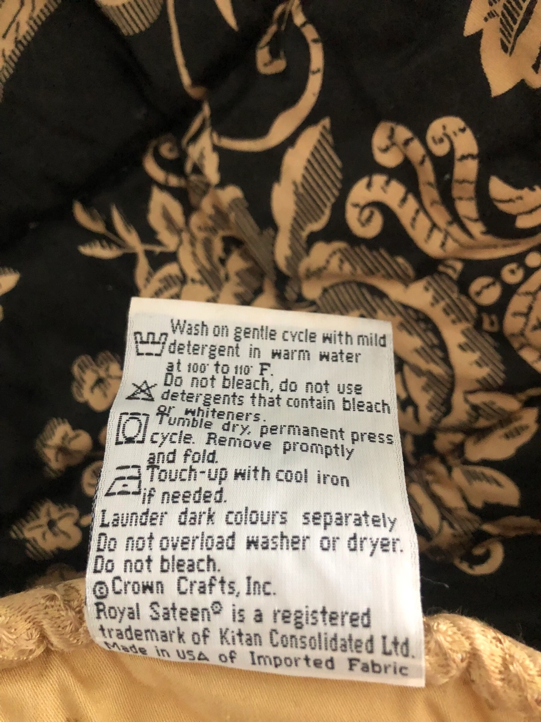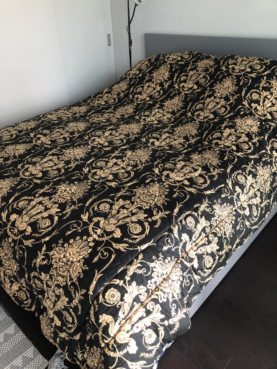 Elegant queen-size quilt. Features a black and gold damask pattern. 100% Egyptian combed cotton. 220 thread count. Easy-care finish. Made in the USA of imported fabric.