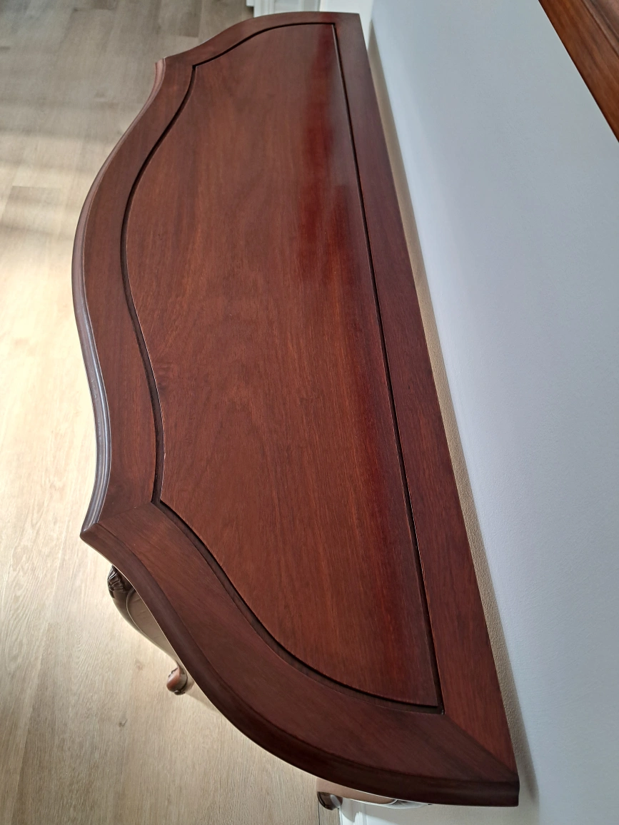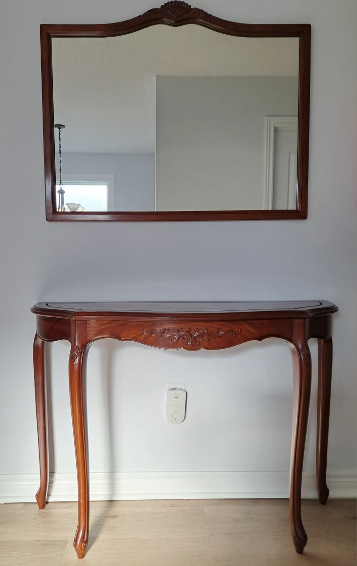 This console table with mirror is a beautiful, hand-carved elegance, perfect for hallways and living areas.