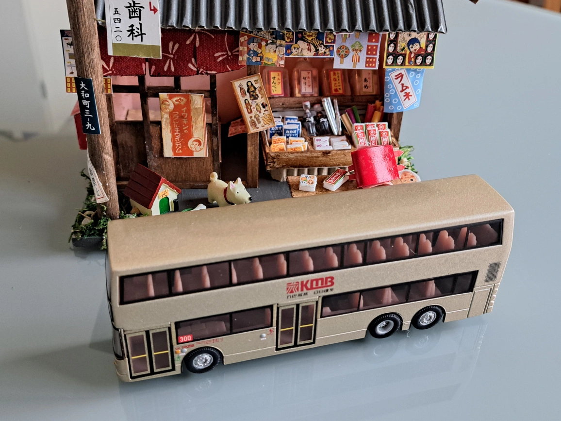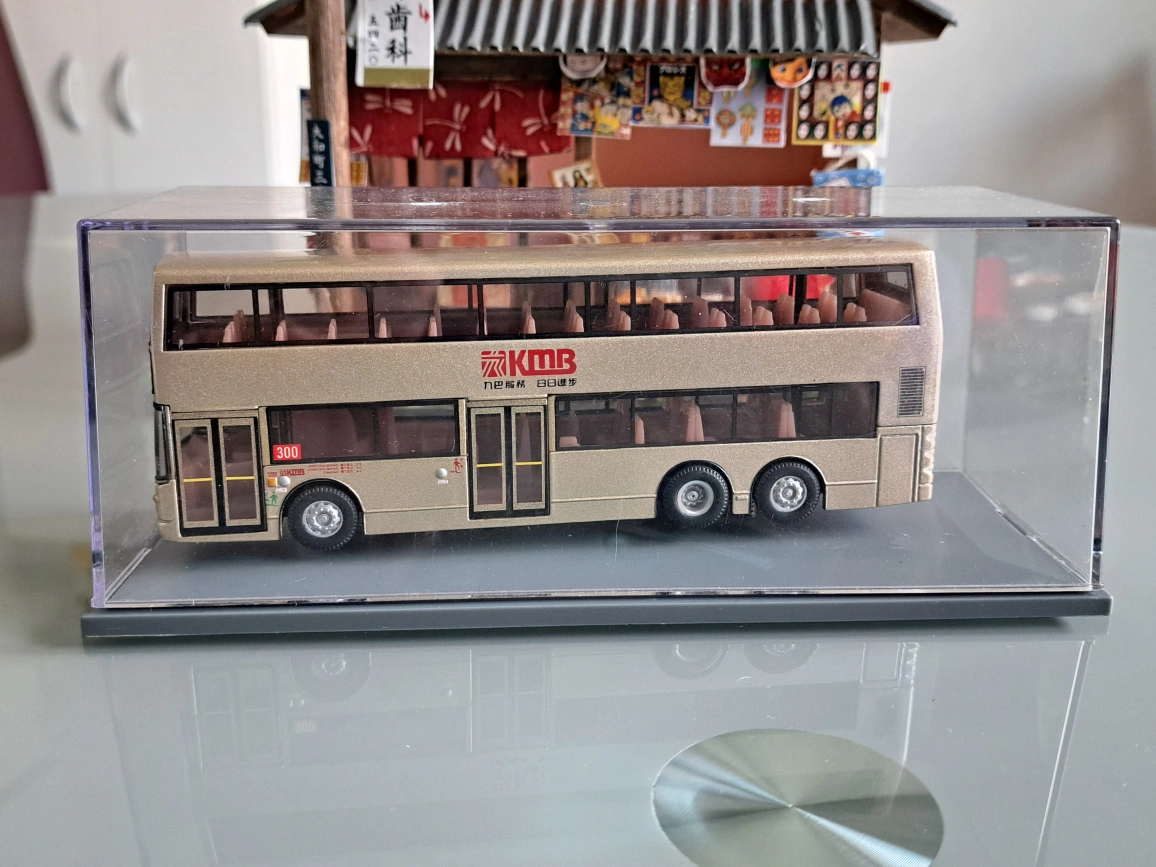 Detailed diecast model of a Kowloon Motor Bus double-decker. Gold coloured body. Route number 300 clearly visible. Collectible item. Excellent condition.