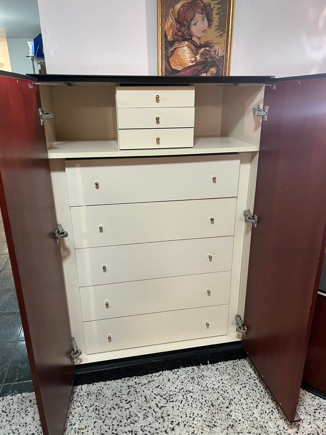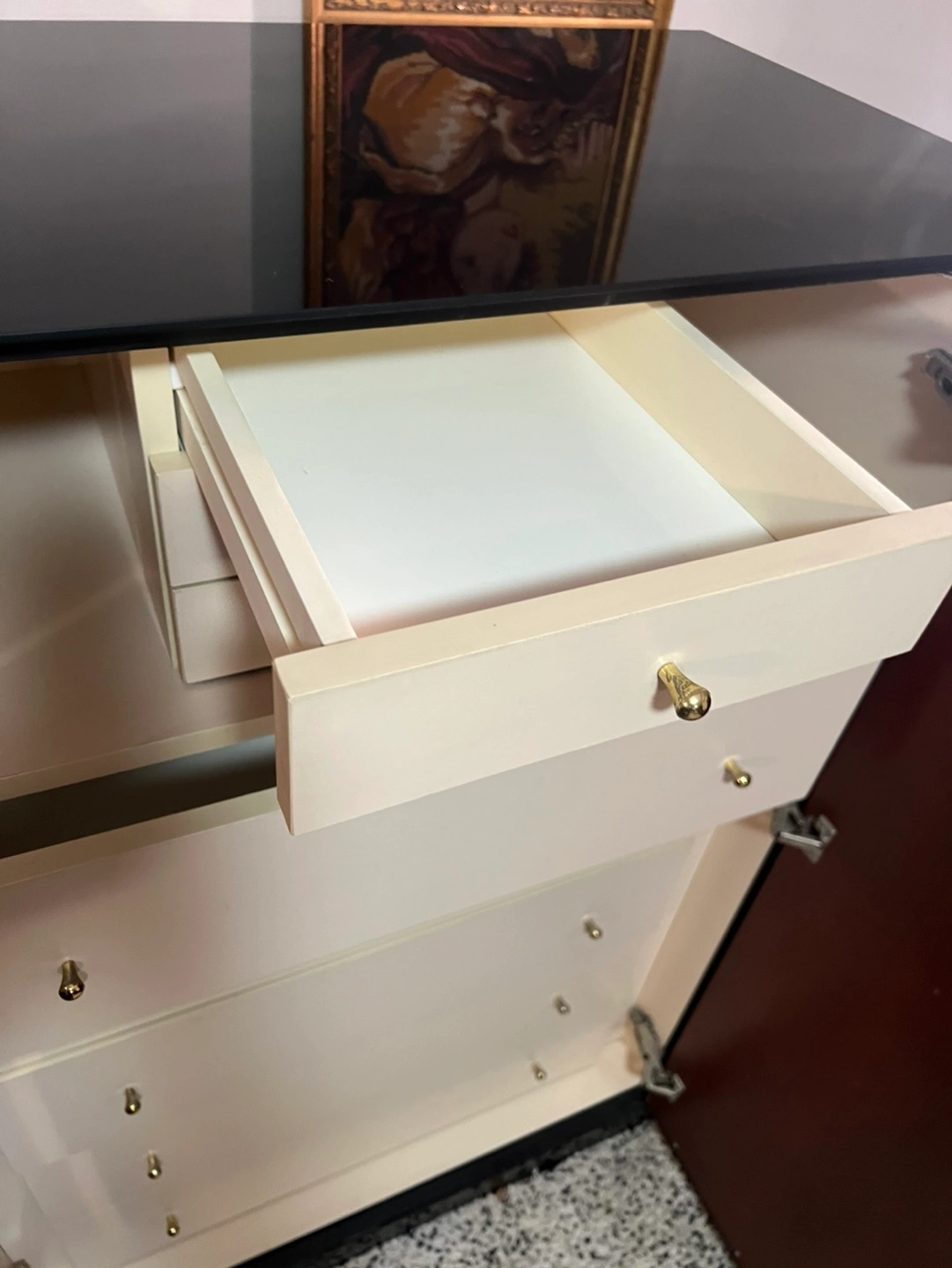 Armories dresser with five regular size drawers and three small size drawers for small items. The unit is very heavy due to thick tempered black glass covering top and sides. Drawers open and close as they should.