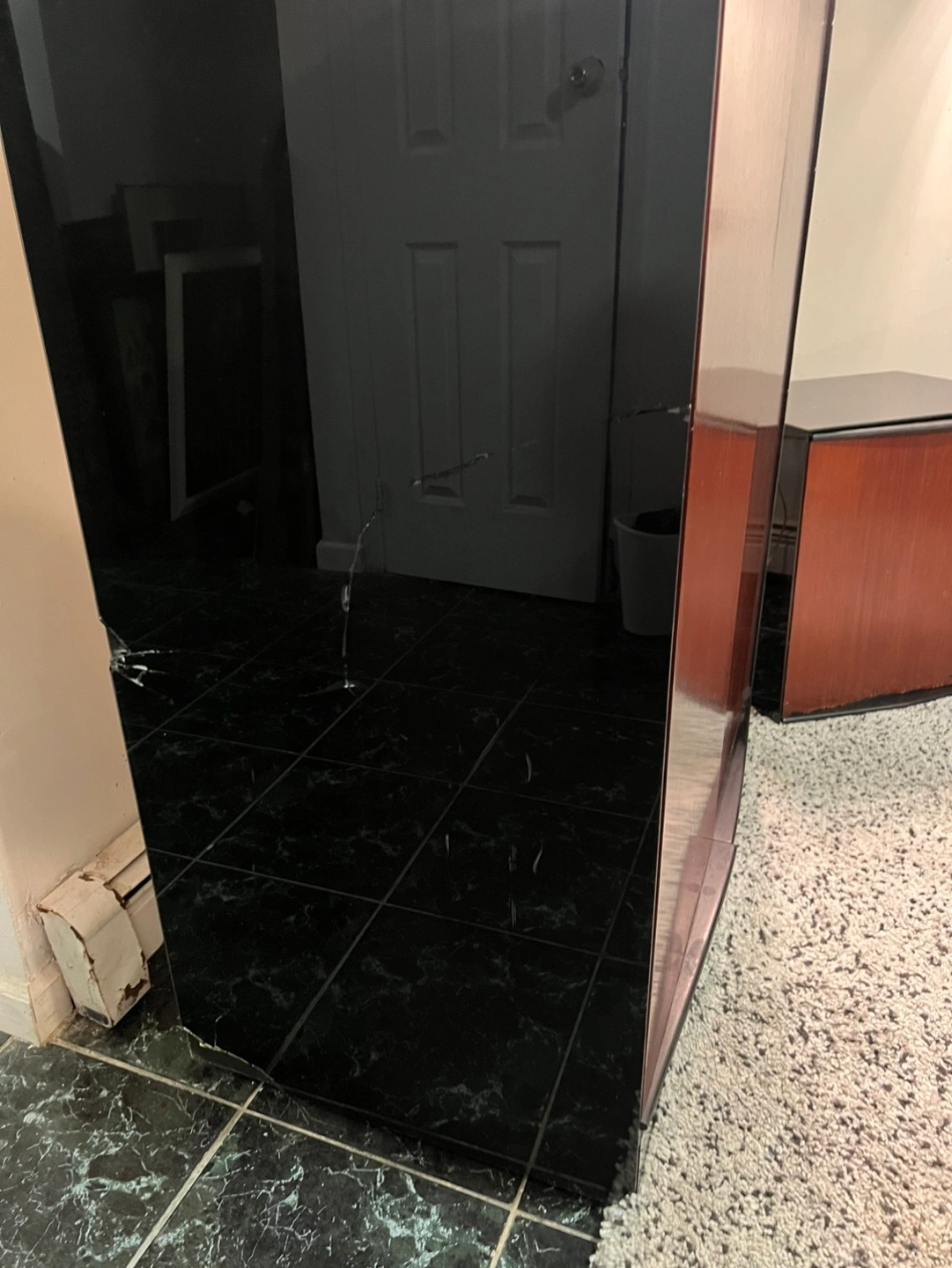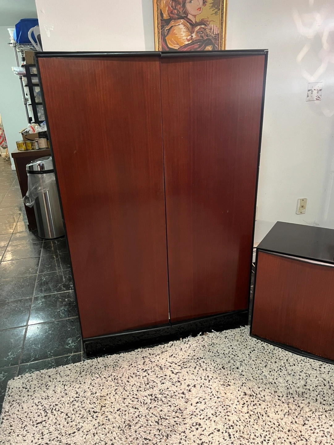 There are some cosmetic wear but not noticeable except the armoire left side the glass is cracked/broken but doesn’t prevent functionality. It can be covered with other black material or put that side against the wall. See image.