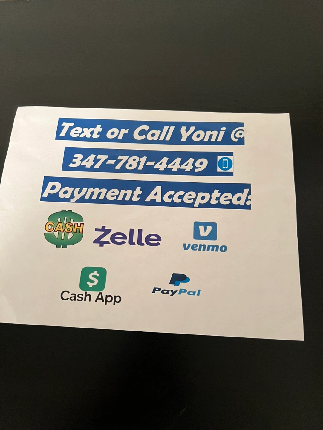 Cash, Zelle, Venmo, PayPal or CashApp are all good for payment.