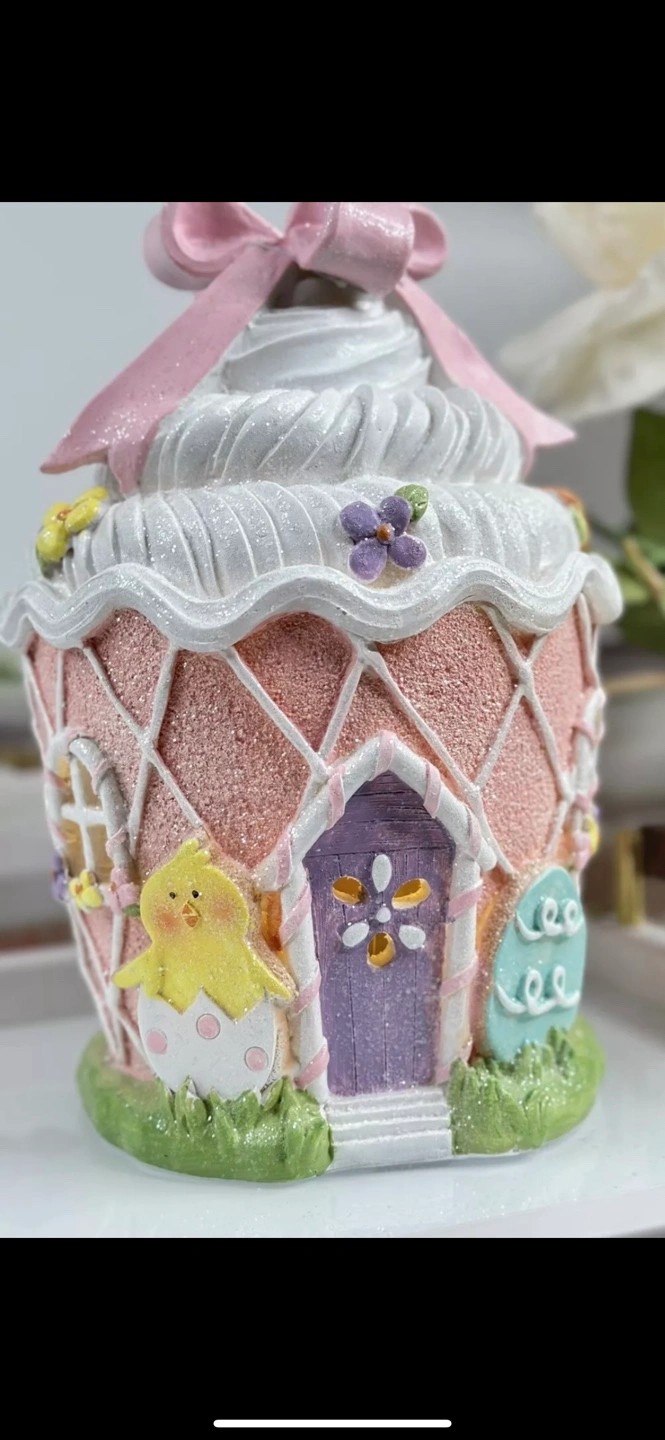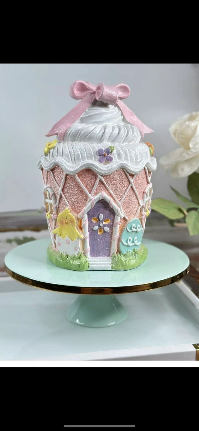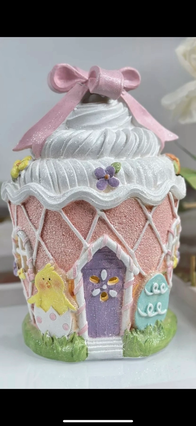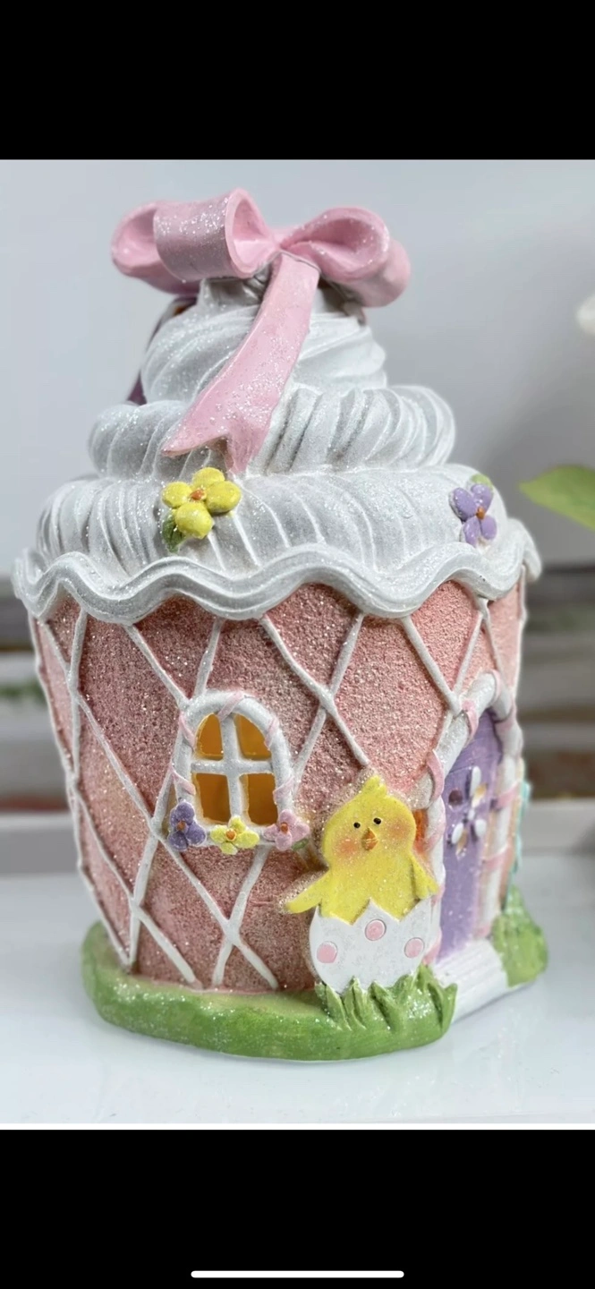 Charming cupcake-shaped house perfect for Easter. Features pastel colours, cute chick details, and a pink bow. Great for decorating your home during springtime.