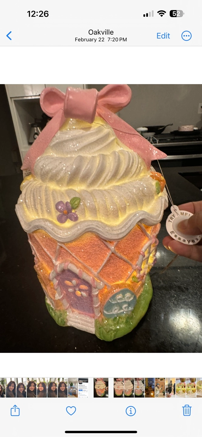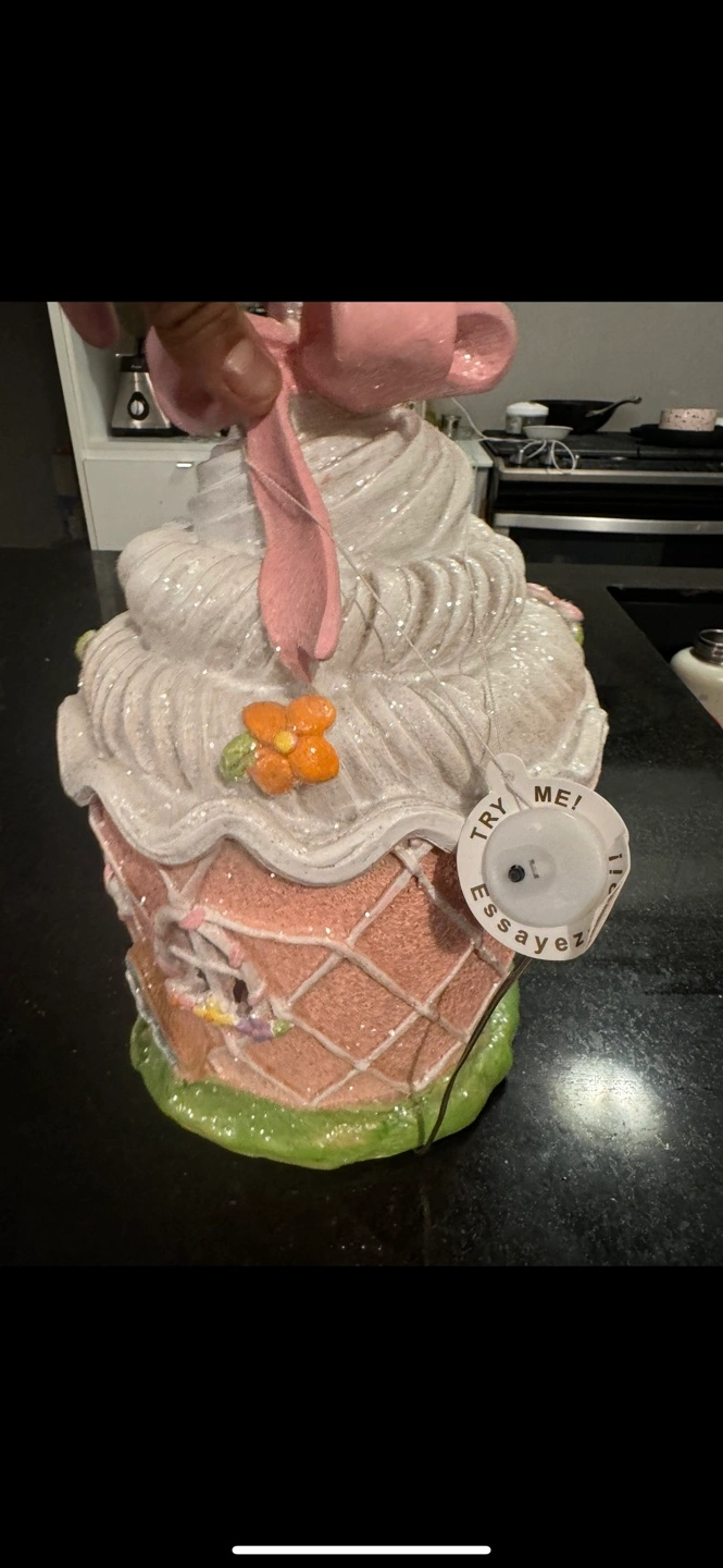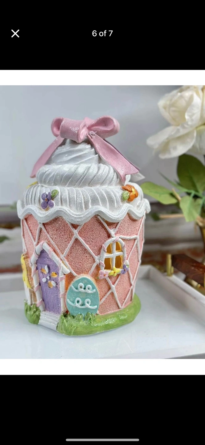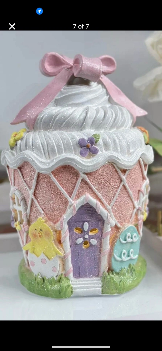 Charming cupcake-shaped house perfect for Easter. Features pastel colours, cute chick details, and a pink bow. Great for decorating your home during springtime.