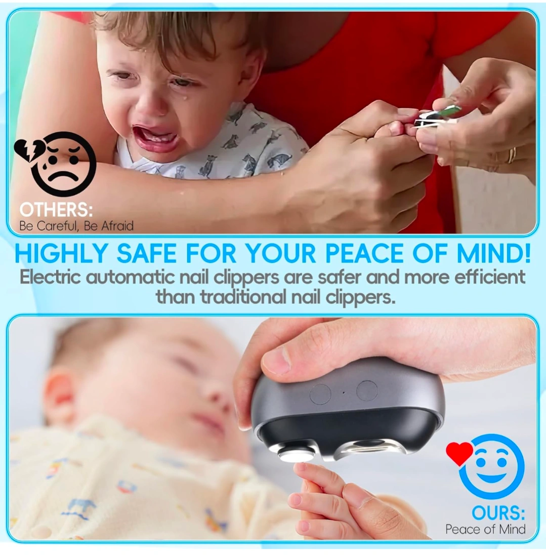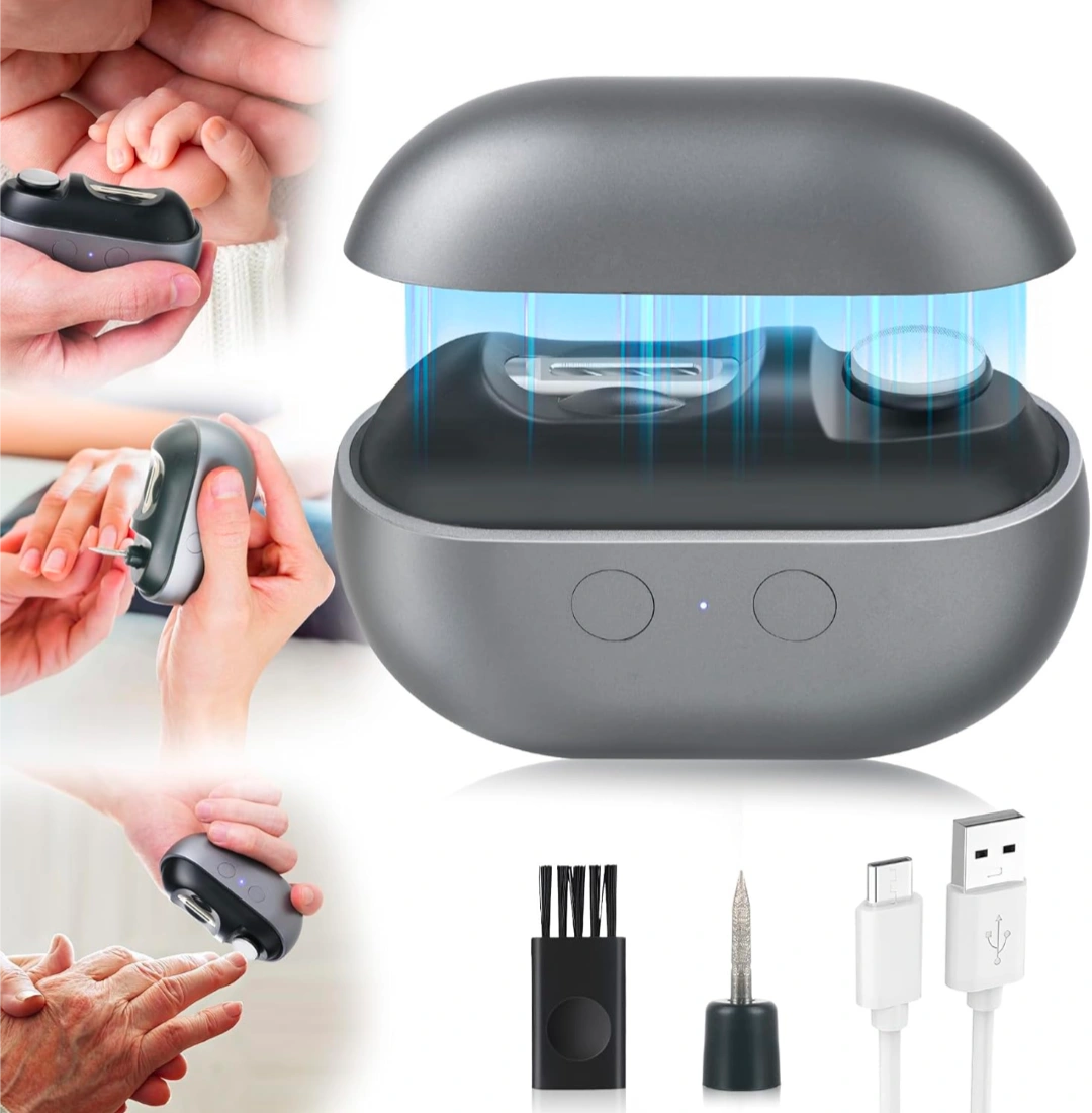 Electric automatic nail clippers. Safe and efficient. Two speeds. USB charging. Includes cleaning brush and extra cutter. Compact and portable.