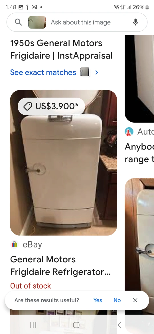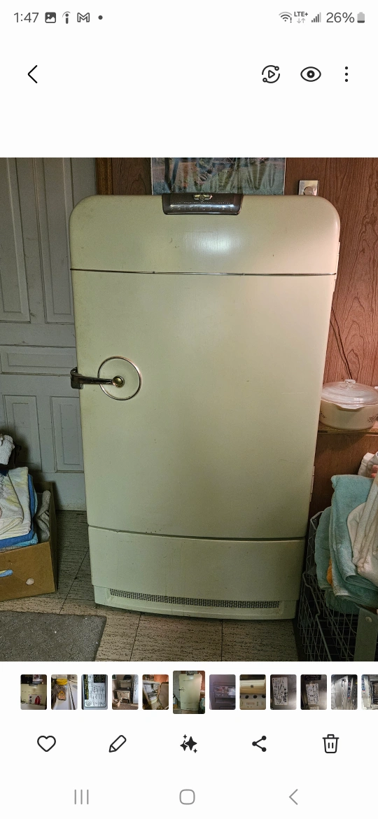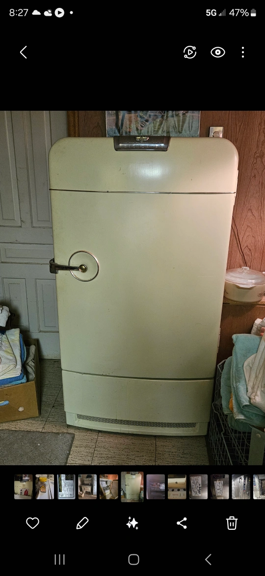 20Antique refrigerator, pale off white colour. very good condiition and works great. Great for a retro kitchen or restoration project.