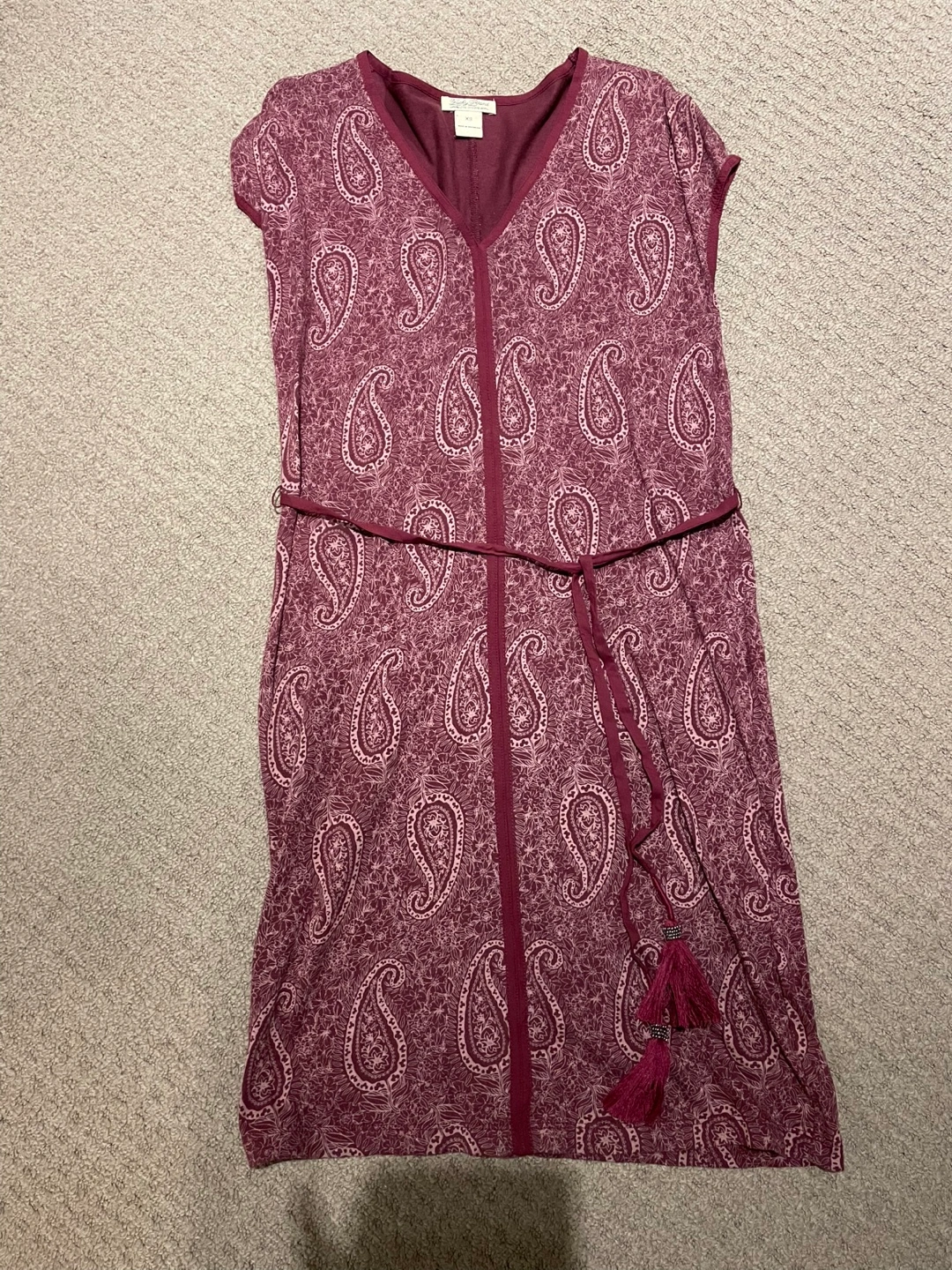 Casual summer dress. Burgundy with a paisley print. Features a V-neck and short sleeves. Includes a self-tie waist belt with tassels.