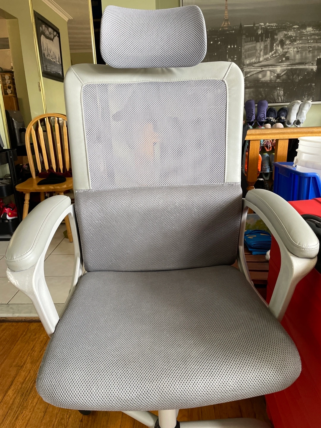 Comfortable office chair. Grey mesh fabric. Headrest included. Adjustable. Good for home or office use.