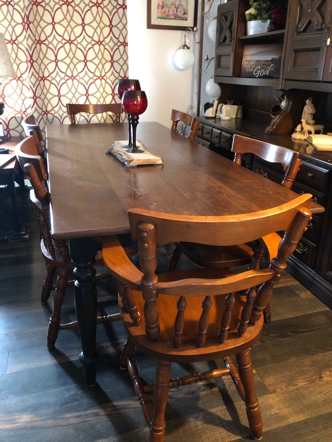 This is a harvest style table painted black bottom and wood stain is on the brown side with a dark red undertone