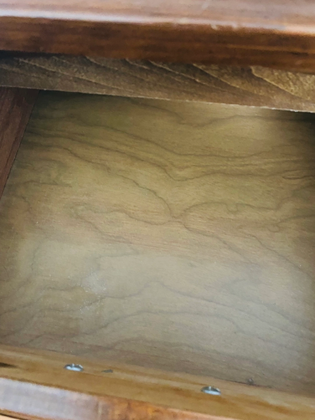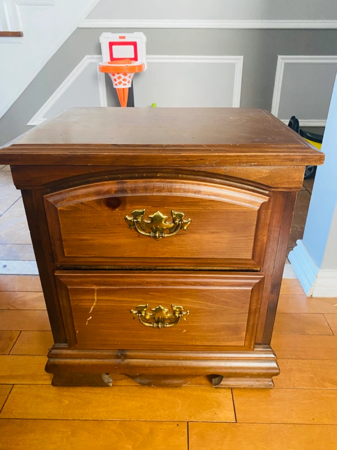 Two-drawer nightstand. Solid wood construction. Ideal for a bedroom or small space. Gold-toned drawer pulls.