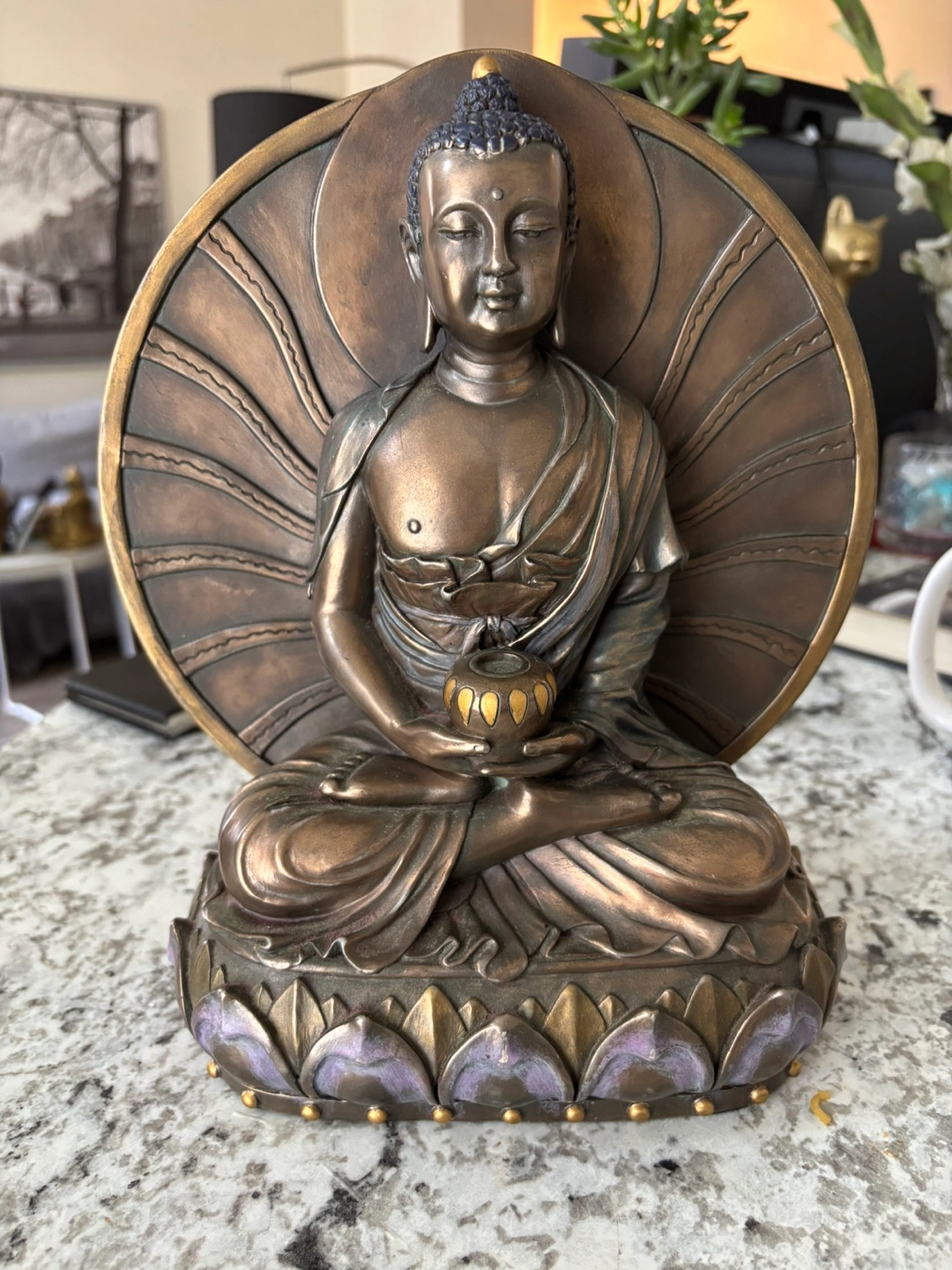 Ornate bronze Buddha statue. Sitting position, holding a bowl. Features a detailed mandala-style background. Beautiful addition to any home.