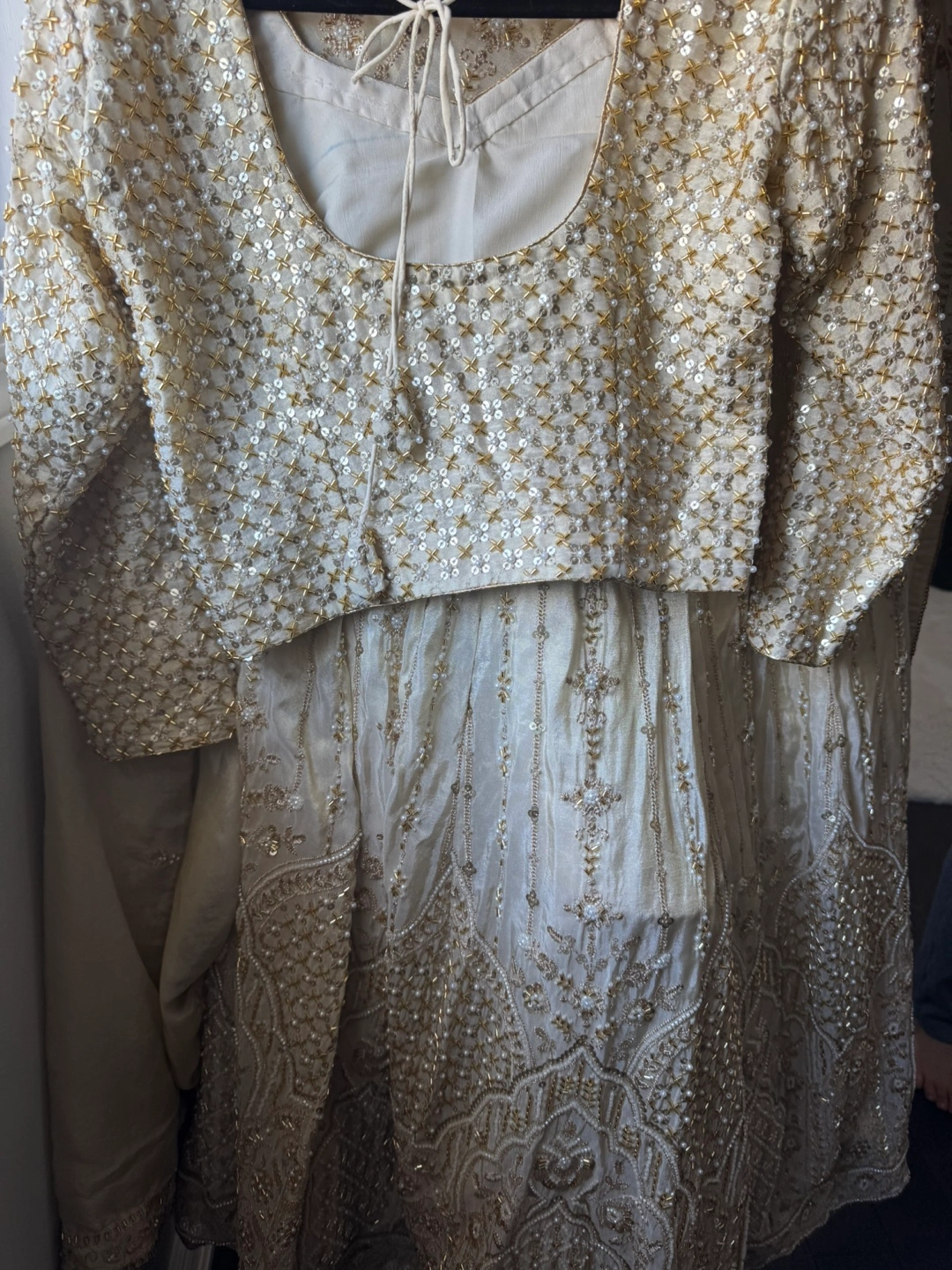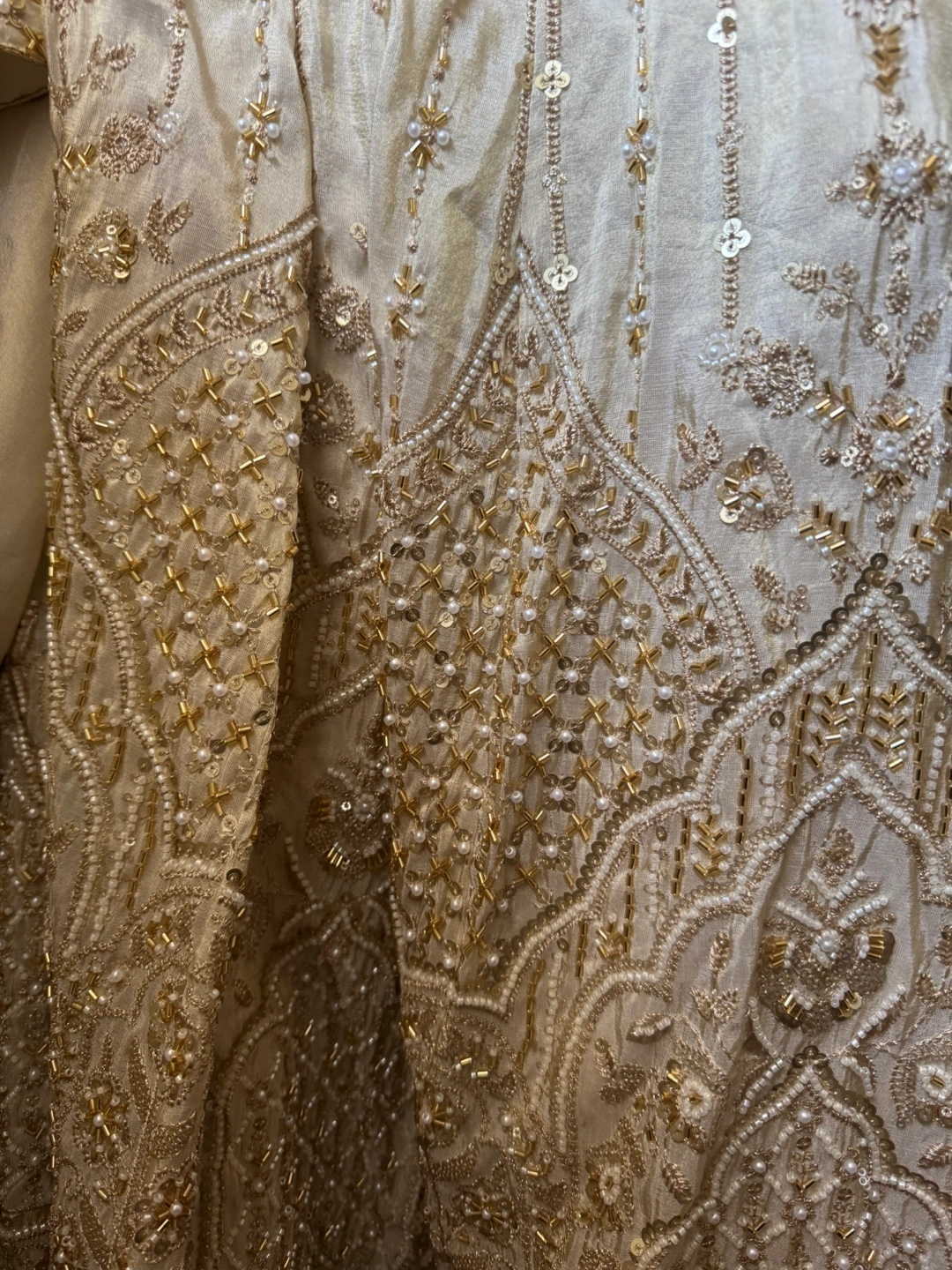 Stunning champagne-coloured lehenga choli. Intricate gold beading and embroidery throughout. Beautiful detailing. Three-quarter sleeves. Perfect for a special occasion.