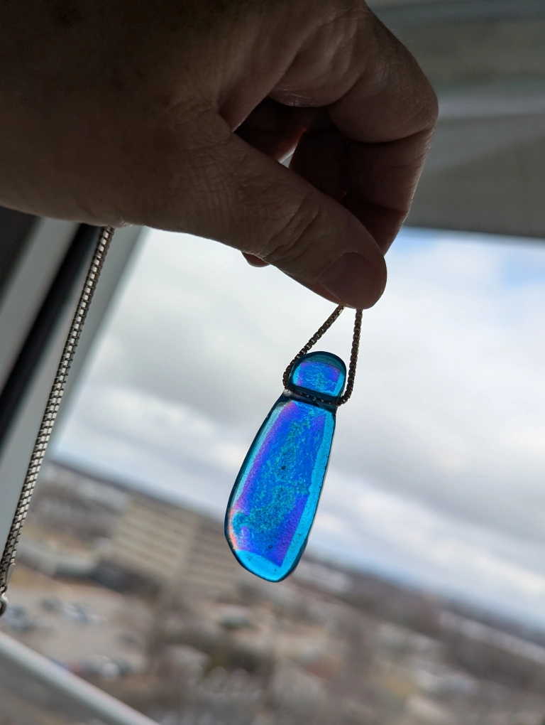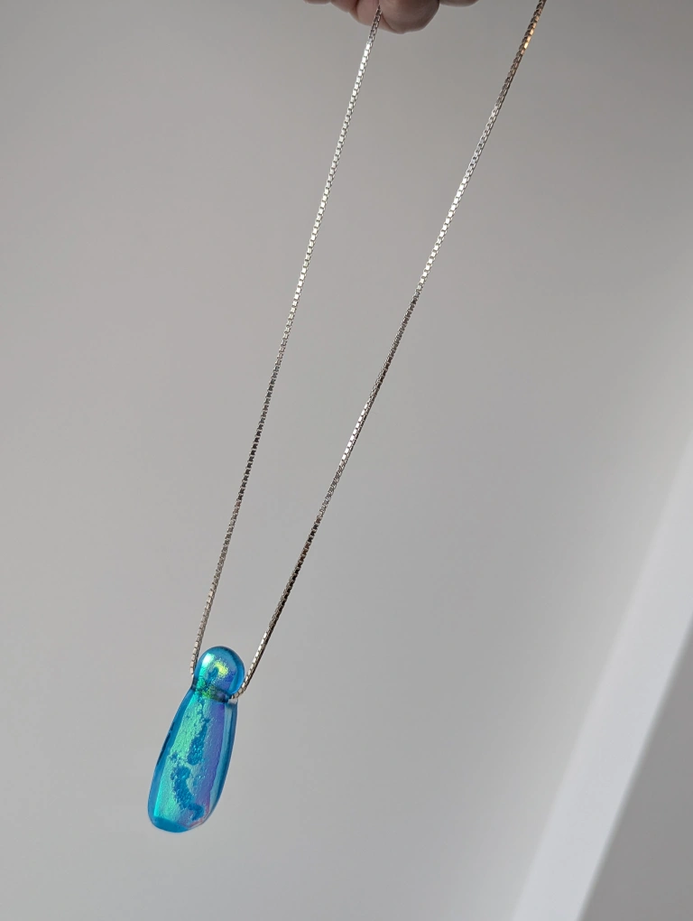 Unique dichroic glass pendant. Beautiful blue and iridescent colours. Sterling silver chain. Lobster clasp. Made in Italy. MJ hallmark on clasp.