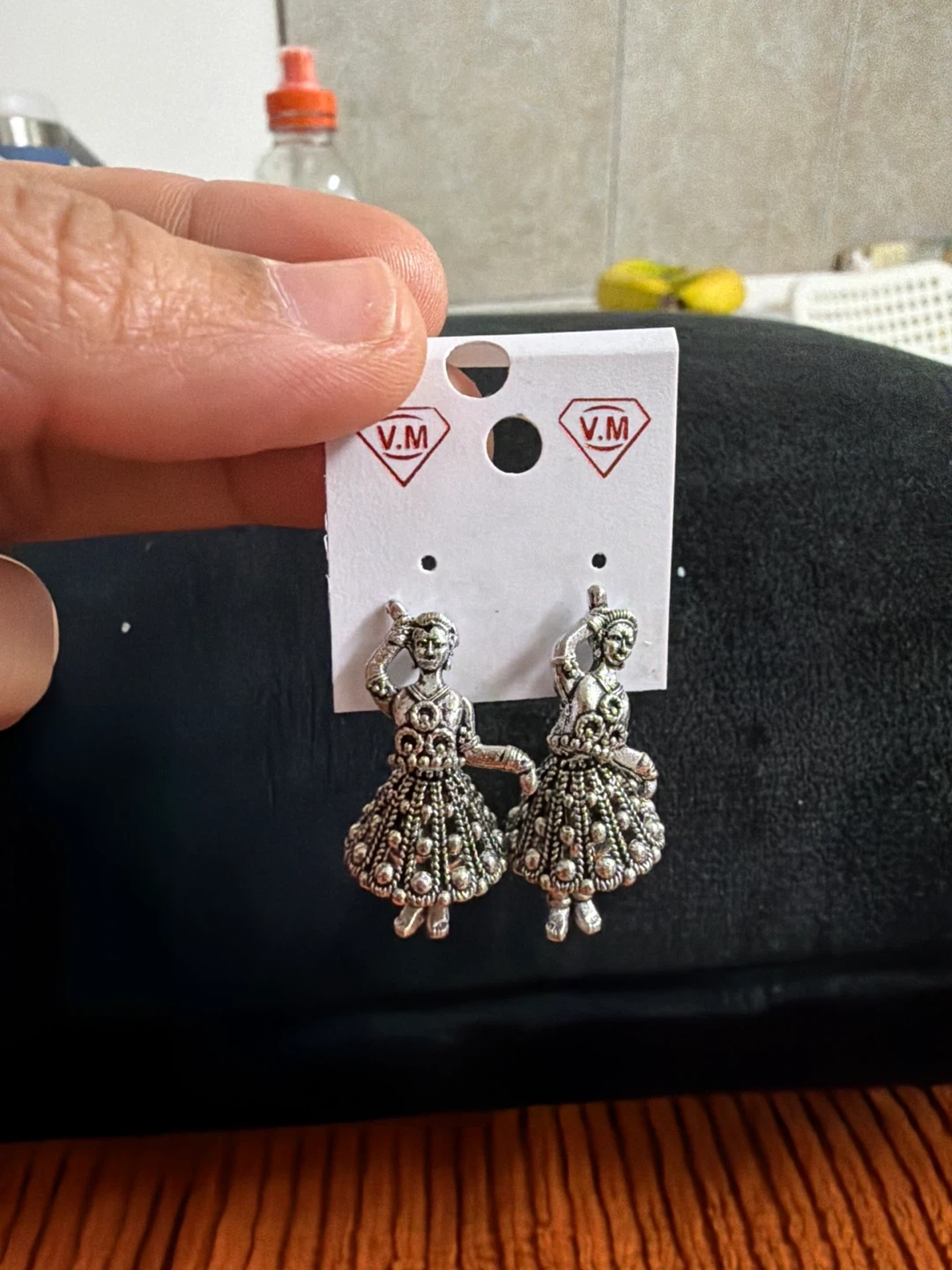 Beautiful oxidized silver-tone earrings featuring intricate classical dancer design. Detailed craftsmanship with traditional attire and graceful pose makes them perfect for festive wear, weddings, Navratri, or cultural events. Lightweight yet statement-making.