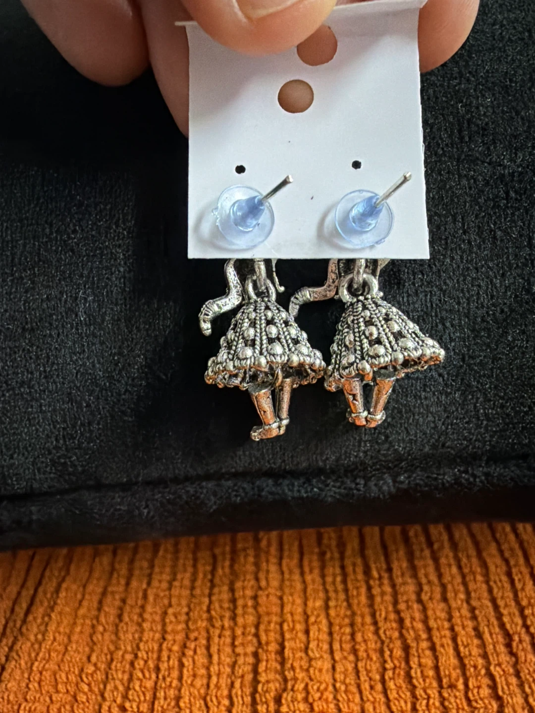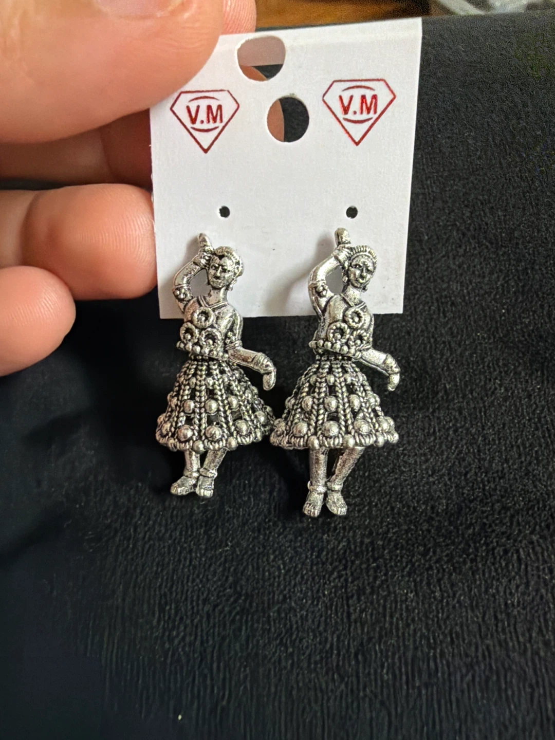 Beautiful oxidized silver-tone earrings featuring intricate classical dancer design. Detailed craftsmanship with traditional attire and graceful pose makes them perfect for festive wear, weddings, Navratri, or cultural events. Lightweight yet statement-making.