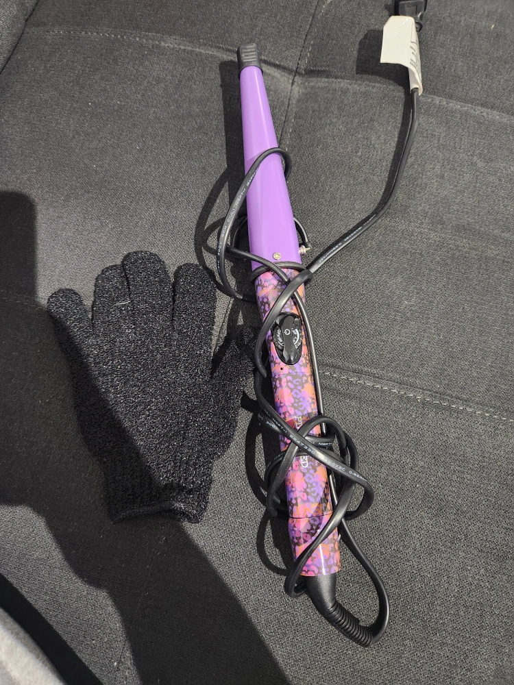 Used purple curling wand. Features a patterned barrel. Includes a black heat resistant glove. Power cord included.