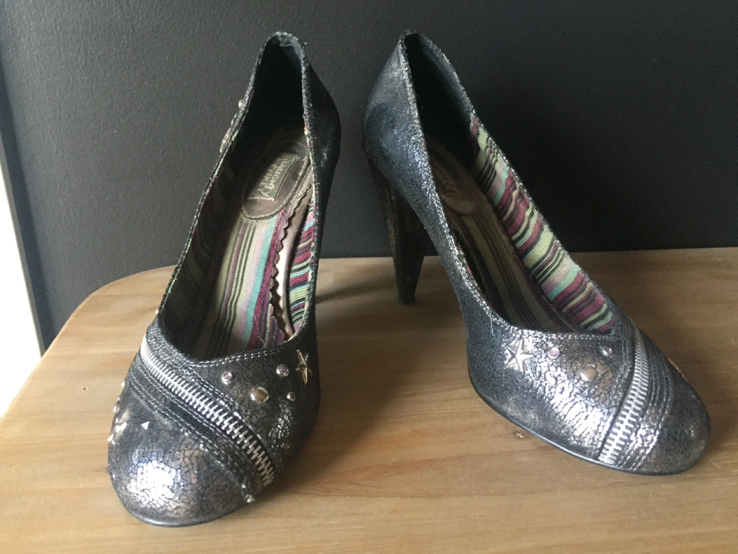 120Stylish silver metallic high heels. Features a unique zipper detail and star embellishments. Slight wear on soles. Worn a handful of times. Great, unique shoes.