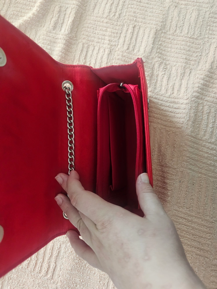 Red suede crossbody bag. Features a silver chain strap and small interior pocket. Perfect for evenings out.