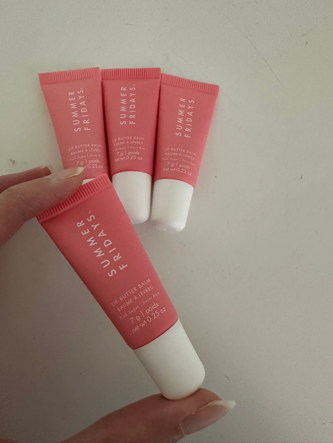 Four mini tubes of Summer Fridays Lip Butter Balm. Pink Sugar scent. Each tube is 7 g / 0.25 oz.