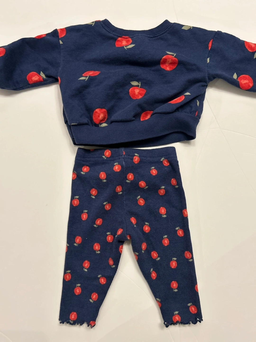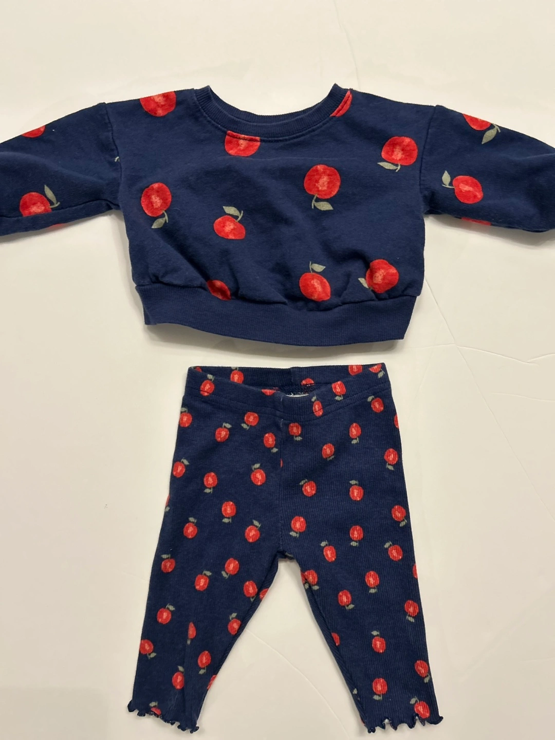123Cute two-piece outfit. Features a navy blue sweatshirt and leggings. Both pieces feature a red apple print. Soft material, perfect for playtime or a special occasion. 6 months