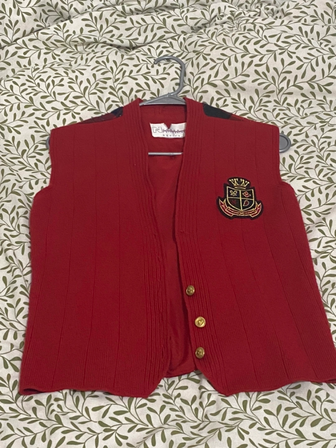 Women's red ribbed knit vest. Features a plaid back detail that ties. Gold buttons and an embroidered crest. Tag says petite but it fits like a medium!