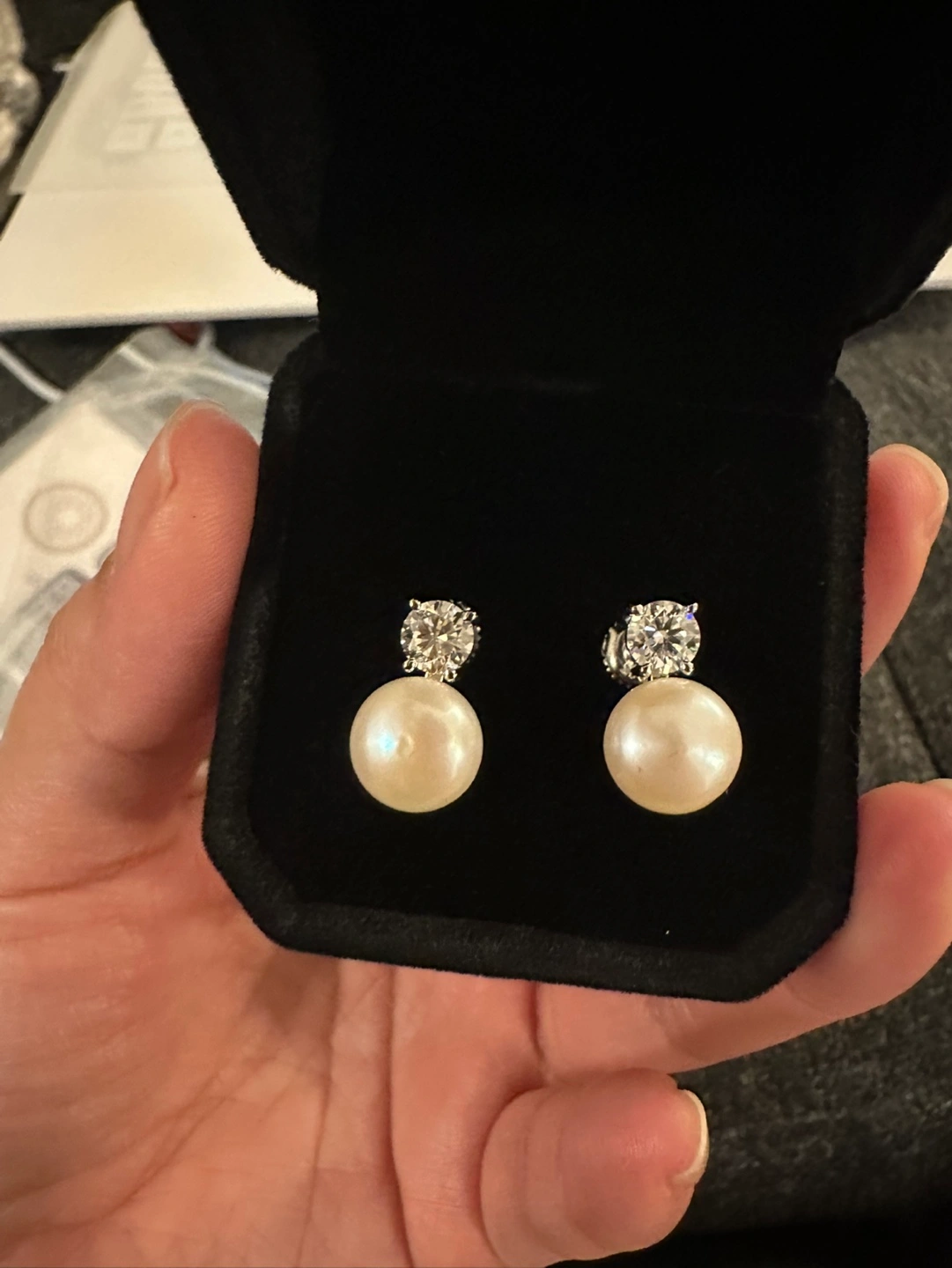 . Elegant pearl and moissanite earrings. 925 Silver, Come in original box with certificate. Size 5.0mm. Weight 0.5ct. Colour D.
