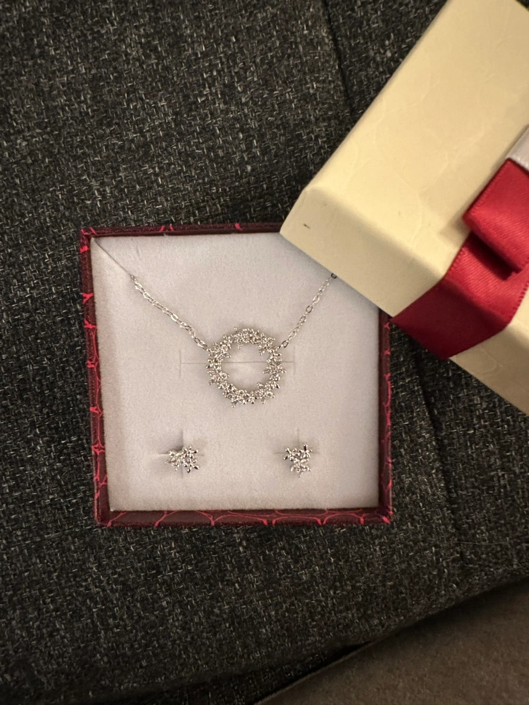 Beautiful silver necklace and earring set. Circle pendant necklace with small stones. Matching stud earrings. Presented in a gift box. 925 silevr set