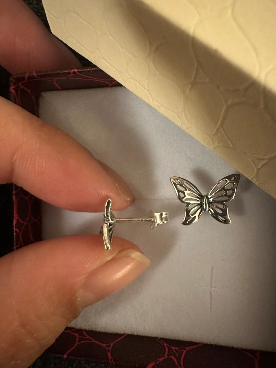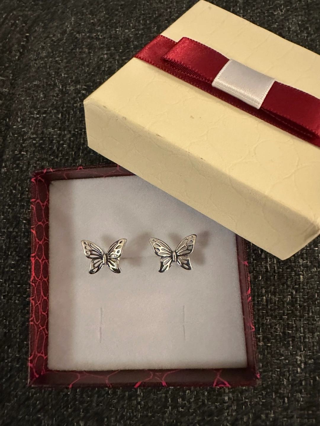 Pair of silver butterfly stud earrings. Cute and delicate design. Come in a gift box. Perfect for everyday wear.