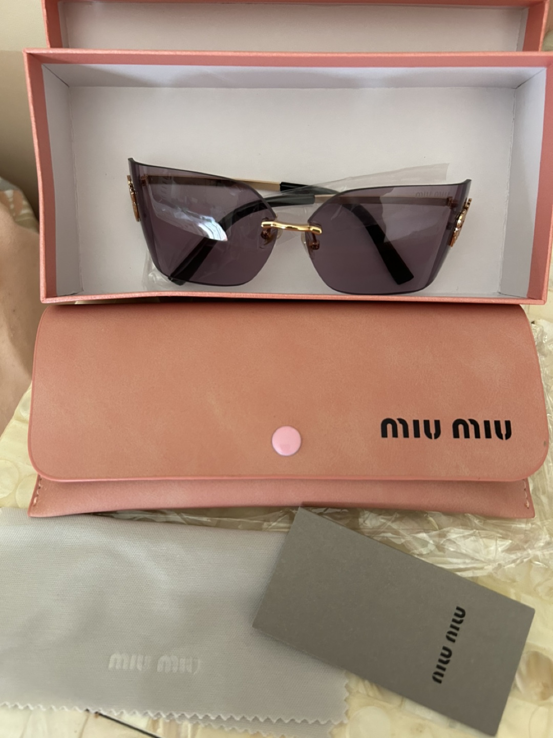 New Miu Miu sunglasses., gold accents. Includes original box, case, and cleaning cloth. Stylish and elegant design.