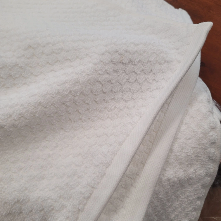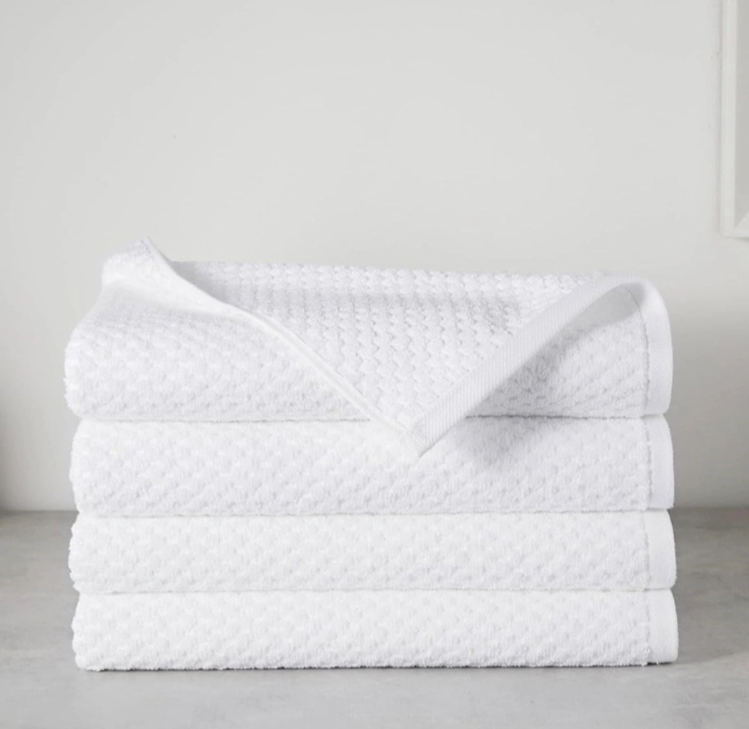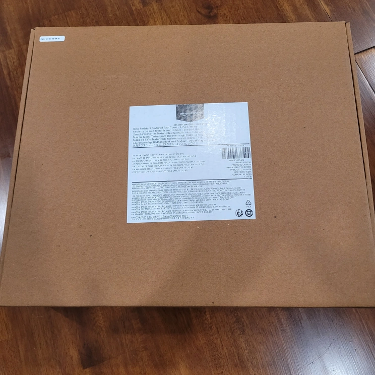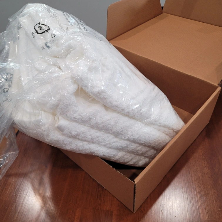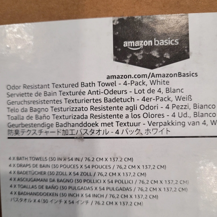 New, unopened 4-pack of Amazon Basics white bath towels. Odor resistant and textured. Large size.