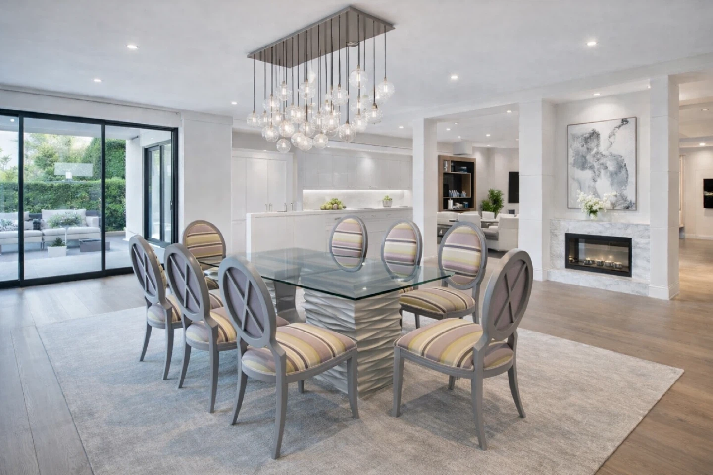 Glass Dining Table with 6 Striped Chairs